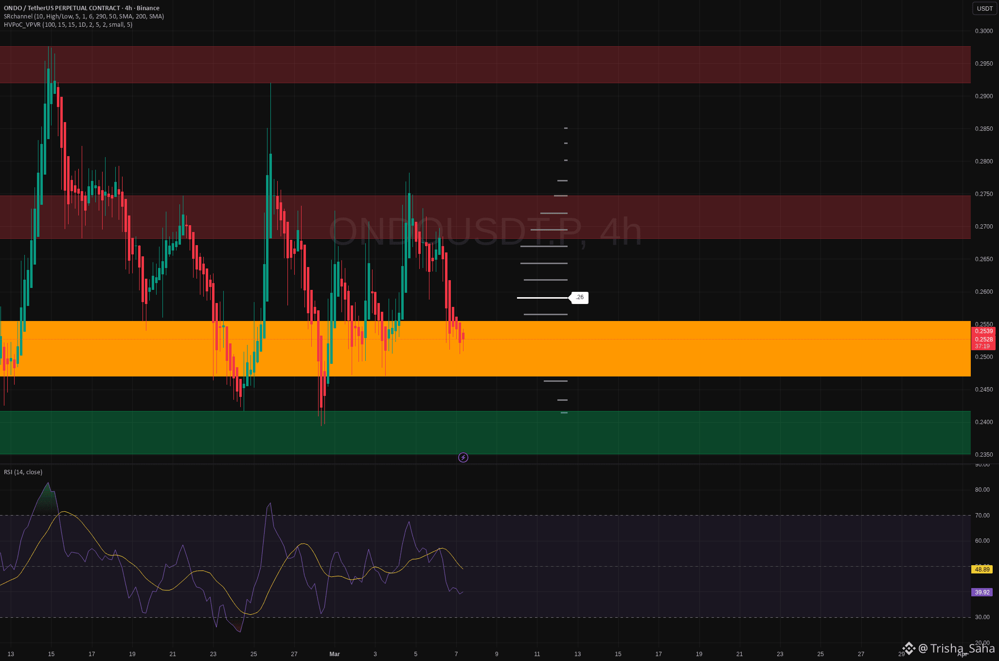 On the 4H chart we’re sitting right in the thick orange block around 0.25, which has acted as a heavy high‑volume node and launchpad several times. RSI is hanging just below mid‑range, showing cooled momentum but not full capitulation, so I’m leaning toward a bounce rather than a breakdown. As long as this box holds, I like the long side with first liquidity magnet around 0.26 and then the lower edge of the red supply zone near 0.27.