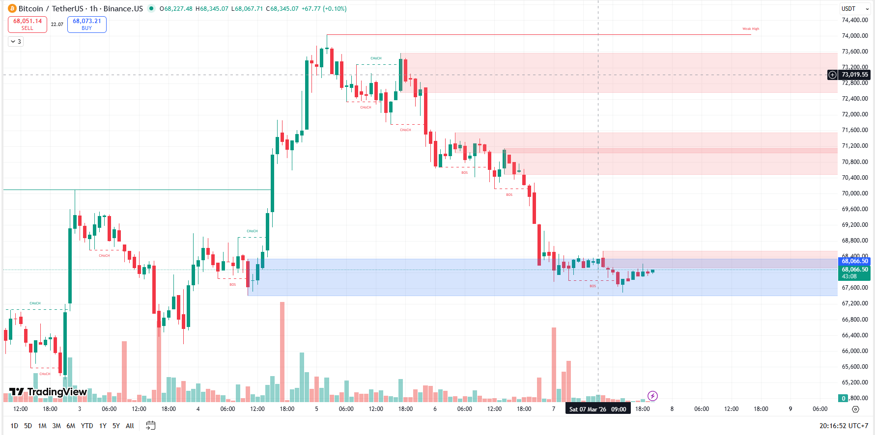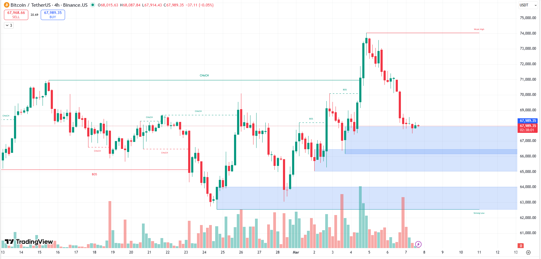 A questo punto, il prezzo cercherà zone di acquisto più profonde, dove il livello Strong Low intorno ai 63.000 USD sarà l'ultimo punto di appoggio.