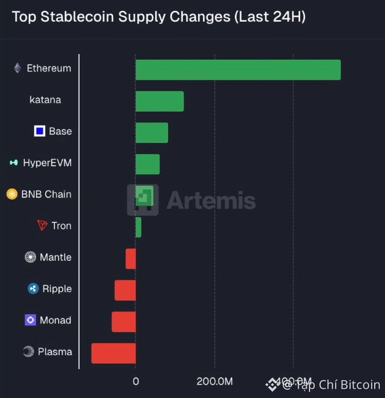 Bức tranh kỹ thuật đó càng được củng cố bởi sự gia tăng của thanh khoản stablecoin. Dữ liệu từ Artemis cho thấy hơn 500 triệu USD stablecoin đã được hấp thụ trên mạng lưới Ethereum chỉ trong 24 giờ, vượt xa mọi blockchain khác. Đây là tín hiệu cho thấy dòng tiền đang chủ động tìm đến hệ sinh thái Ethereum.