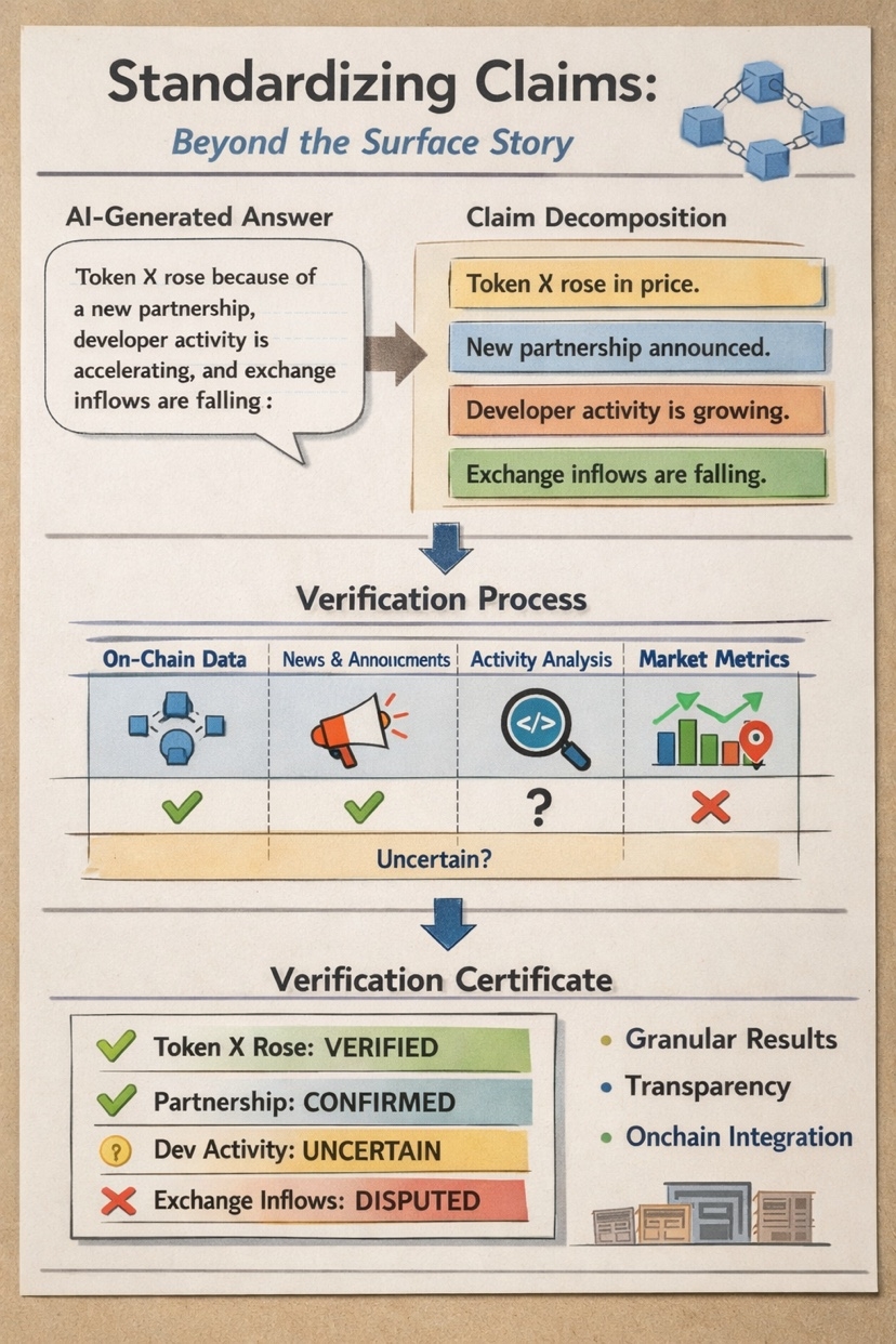 That distinction matters more than it first appears. Crypto systems do not just need intelligence; they need legibility.They need clear units the network can evaluate, pay for, dispute, reward, penalize, and log onchain.A verifier market cannot function well if each participant is effectively verifying a different thing. Standardizing the object of verification is what turns “review” into something closer to infrastructure.The mechanism, at least conceptually, is powerful. An answer or document gets transformed into smaller claims. Those claims are then routed for assessment. Verifiers are not asked to score a vague cloud of meaning; they are asked to evaluate a bounded statement. The output can then be attached to some certificate layer showing which claims passed, which were disputed, and where uncertainty remains.For builders, that is much more important than it sounds. Once claims are decomposed, you can begin to imagine cleaner interfaces for trust. A downstream product does not need to consume one giant “verified” label. It can consume structured confidence. It can know that three factual statements were supported, one causal claim was contested, and two claims lacked enough evidence. That is a very different product surface than the usual binary badge. I think this is where verifier consistency becomes the real story. People often talk about model diversity as the main defense against hallucination. That helps, but only after the verification task has been normalized. If different verifiers are looking at different slices of meaning, diversity does not solve much. It may even hide the problem by producing the appearance of robust review while the network is actually misaligned on the task definition.Imagine an AI-generated market post that says: “Token X rose because of a new partnership, developer activity is accelerating, and exchange inflows are falling.” That looks like one paragraph. In practice, it contains several distinct claims: Token X rose.A partnership got announced. The price move may have been driven by that news. Developer activity also seems to be picking up.Exchange inflows are falling. Each of those needs different evidence, different time windows, and maybe different standards of proof.
