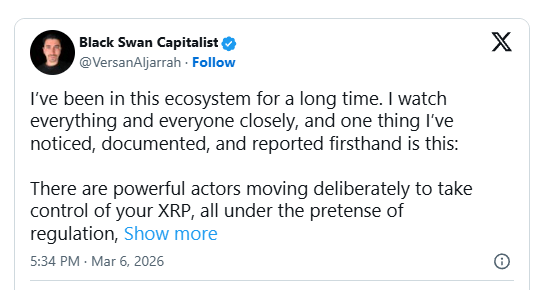 Versan Aljarrah, founder of Black Swan Capitalist, recently voiced such concerns in a post on X, where he delivered a strong warning to XRP holders. Drawing from years of observation within the crypto industry, Aljarrah argued that influential actors may be positioning themselves to gain greater control over XRP through mechanisms tied to regulation, institutional custody, and yield-based financial products.