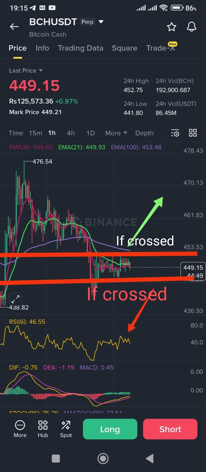The technical indicators of BCH/USDT present a mixed outlook. The price is currently at 449.15, trading below all key EMAs (9, 21, and 100), which typically signals a bearish trend. However, the MACD shows a bullish crossover with a positive histogram (0.45), indicating increasing upward momentum. The RSI(6) at 46.55 is neutral, neither oversold nor overbought, suggesting room for movement. The recent price uptick of +0.97% could be a short-term bounce within a larger downtrend.