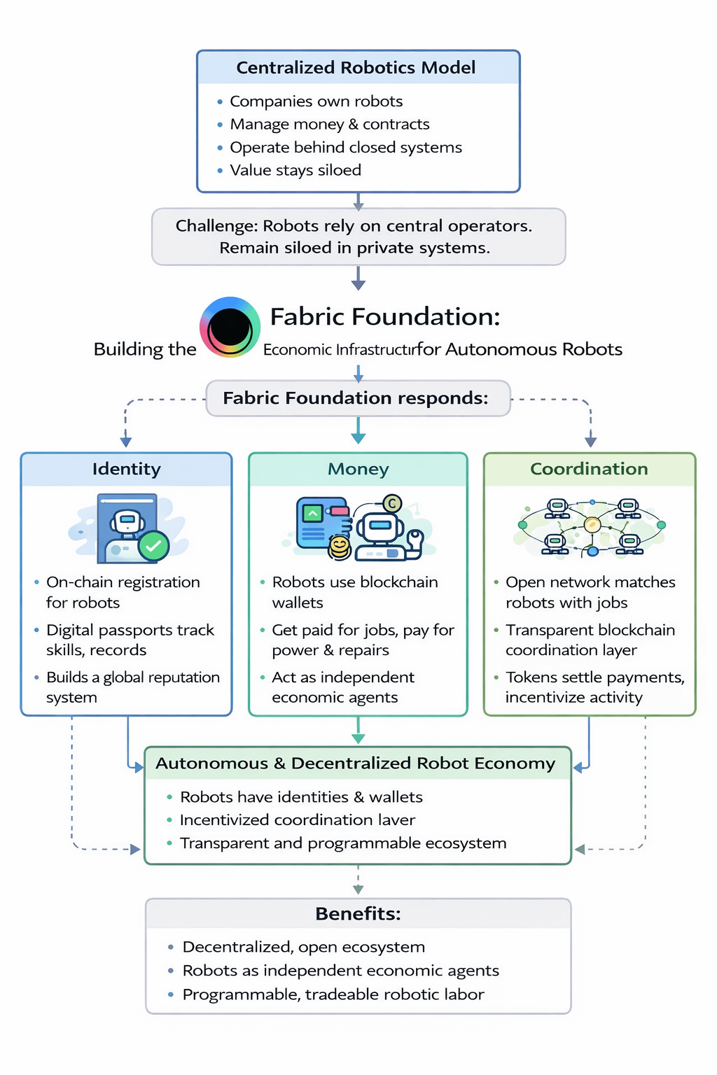 Fabric’s answer is to combine robotics with blockchain.The big idea?Give robots the same building blocks humans use in the economy identities,wallets,a way to participate.With these,robots can plug into digital financial systems,and everyone can see what they’re doing and how well they’re doing it.