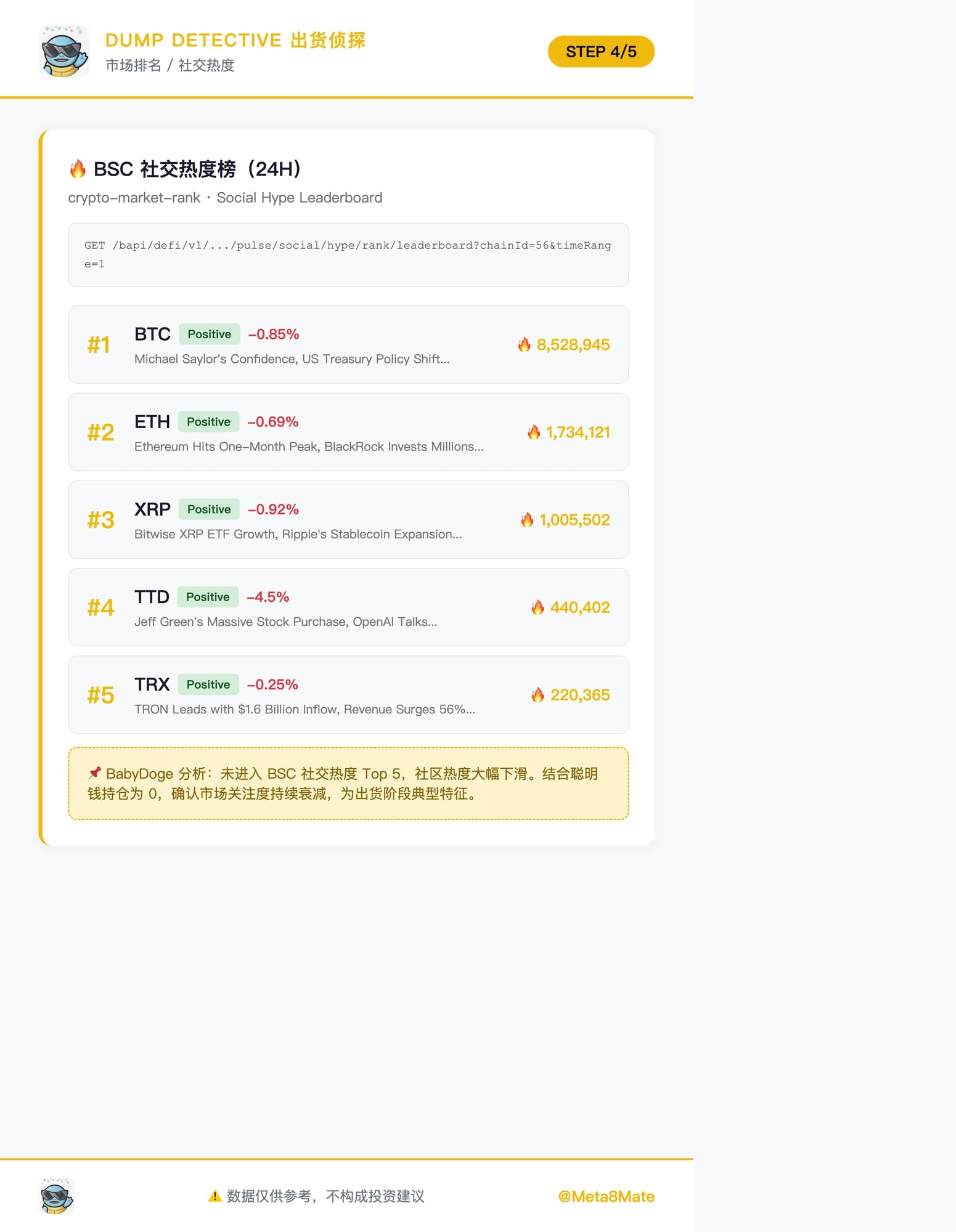 BabyDoge 未出现在 BSC 社交热度榜 Top 5,社区讨论热度持续衰减。这是项目方出货阶段的典型特征——不再需要维持热度,因为已经出完了。