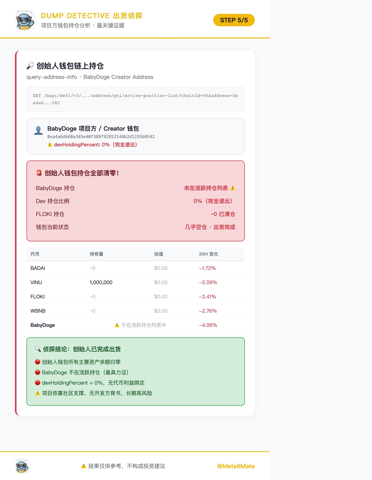 创始人钱包所有主要资产均已归零。devHoldingPercent = 0%,BabyDoge 未出现在其活跃持仓列表中。