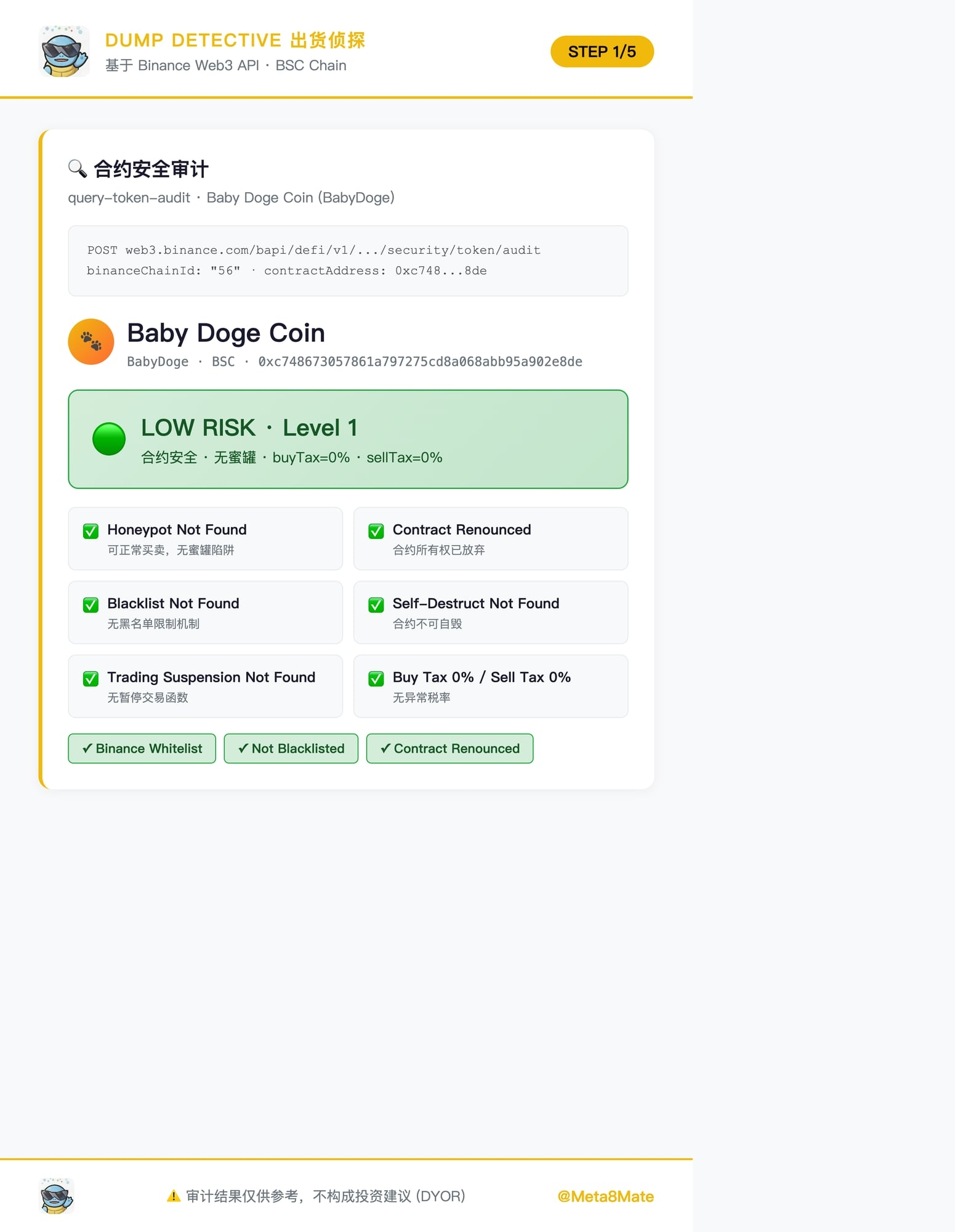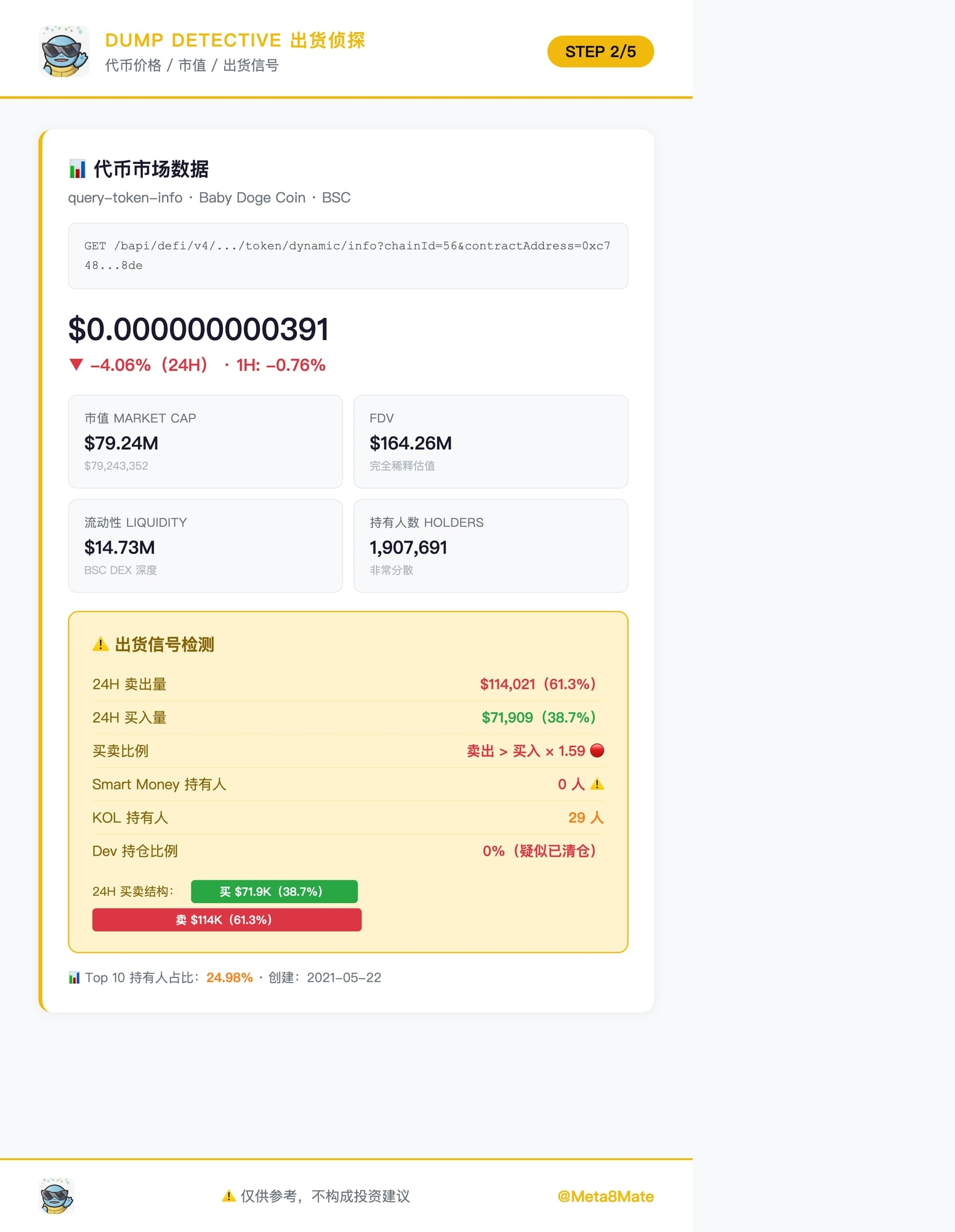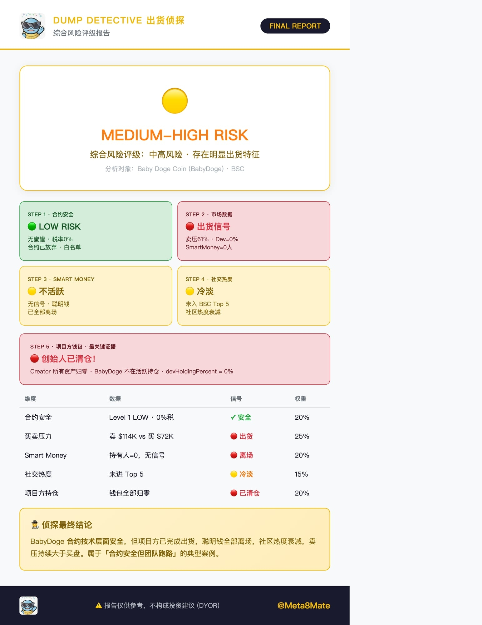 侦探结论:BabyDoge 合约本身安全,无技术风险,但项目方已完成出货,聪明钱全部离场,社区热度低迷,卖压持续大于买盘。属于「合约安全但项目方跑路」的典型案例。