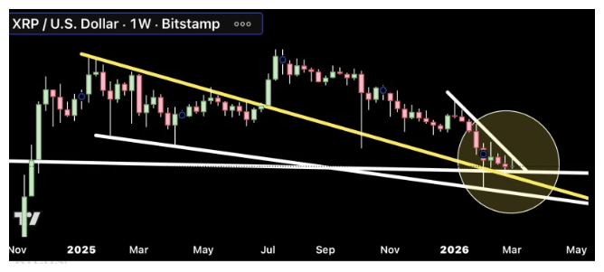 👉 Dopo il forte rally di XRP nel 2025, l'asset è entrato in una fase di consolidamento prolungato, formando massimi decrescenti lungo una linea di resistenza discendente mentre si mantiene sopra un supporto orizzontale definito. Questo ha creato un classico triangolo che si stringe nel grafico settimanale. Gli analisti tecnici riconoscono ampiamente tale compressione come un precursore di un forte movimento direzionale, specialmente quando il prezzo raggiunge la fase finale della formazione. L'analisi del prezzo di XRP indica che i punti di accumulazione a lungo termine puntano a un grande breakout imminente, coerente con ciò che suggerisce la struttura attuale.