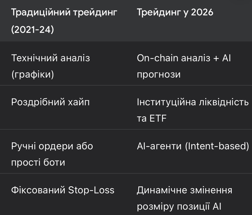 У 2026 році торгівля криптовалютою остаточно трансформувалася: класичні індикатори поступилися місцем AI-агентам, on-chain аналітиці та стратегіям, орієнтованим на інституційну ліквідність.