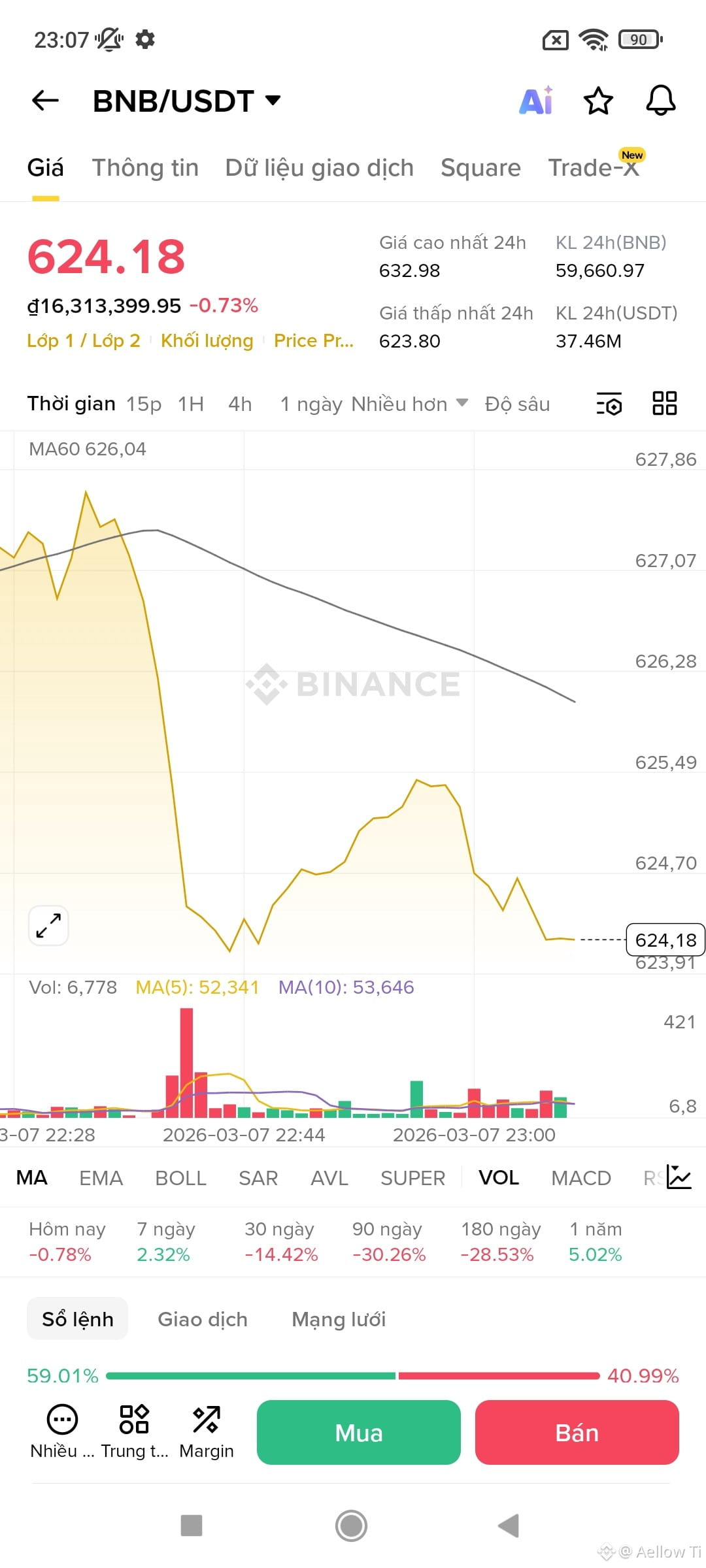 Giá hiện tại: 624.18 USDT, giảm khoảng 0.73% tại thời điểm chụp (nhưng theo dữ liệu thị trường chung trong ngày, mức giảm có lúc lên tới gần 3%).