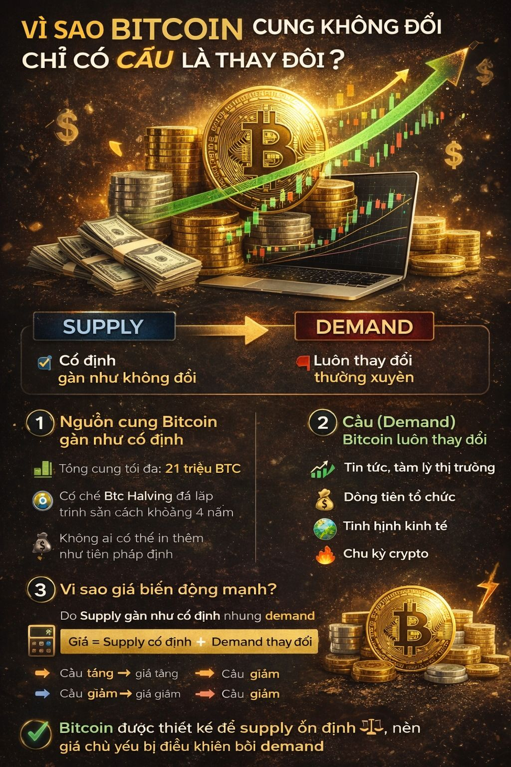 Bitcoin được thiết kế để **supply ổn định**, nên **giá chủ yếu bị điều khiển bởi demand**.