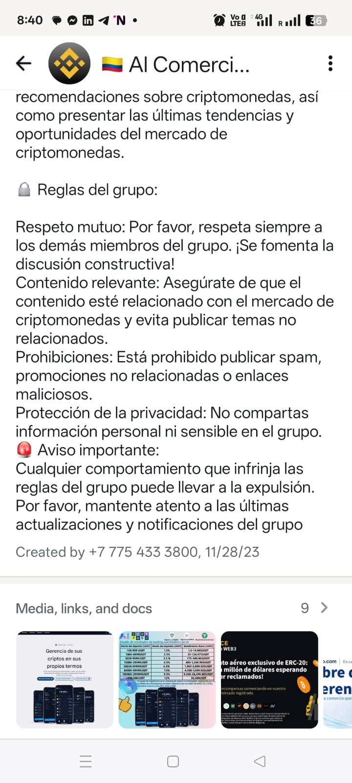 ❌ El grupo fue creado desde un número de Kazajistán (+7 775 433 3800), no de Colombia ni de Binance