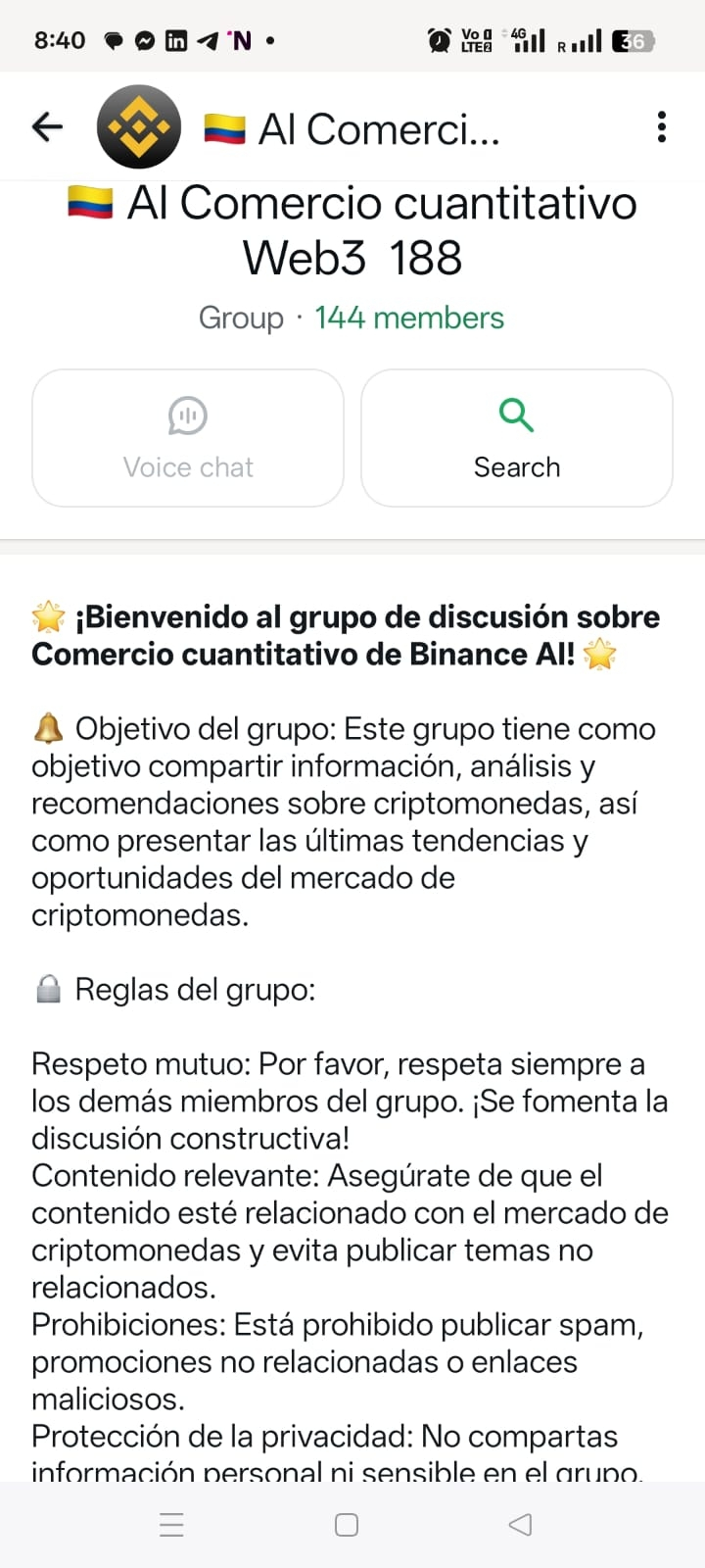 Crean grupos de WhatsApp llamados "Comercio Cuantitativo AI Web3" usando el logo oficial de Binance. El grupo tiene más de 140 miembros (la mayoría son bots falsos para dar credibilidad). Prometen ganancias del 2.5% DIARIO — eso es 912% anual. Ninguna plataforma legítima en el mundo ofrece eso.