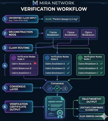 The Mira Solution: When a user asks a complex query on Klok, Mira deconstructs the answer into individual "claims." These claims are sent to a network of independent verifiers who run different models to confirm accuracy.