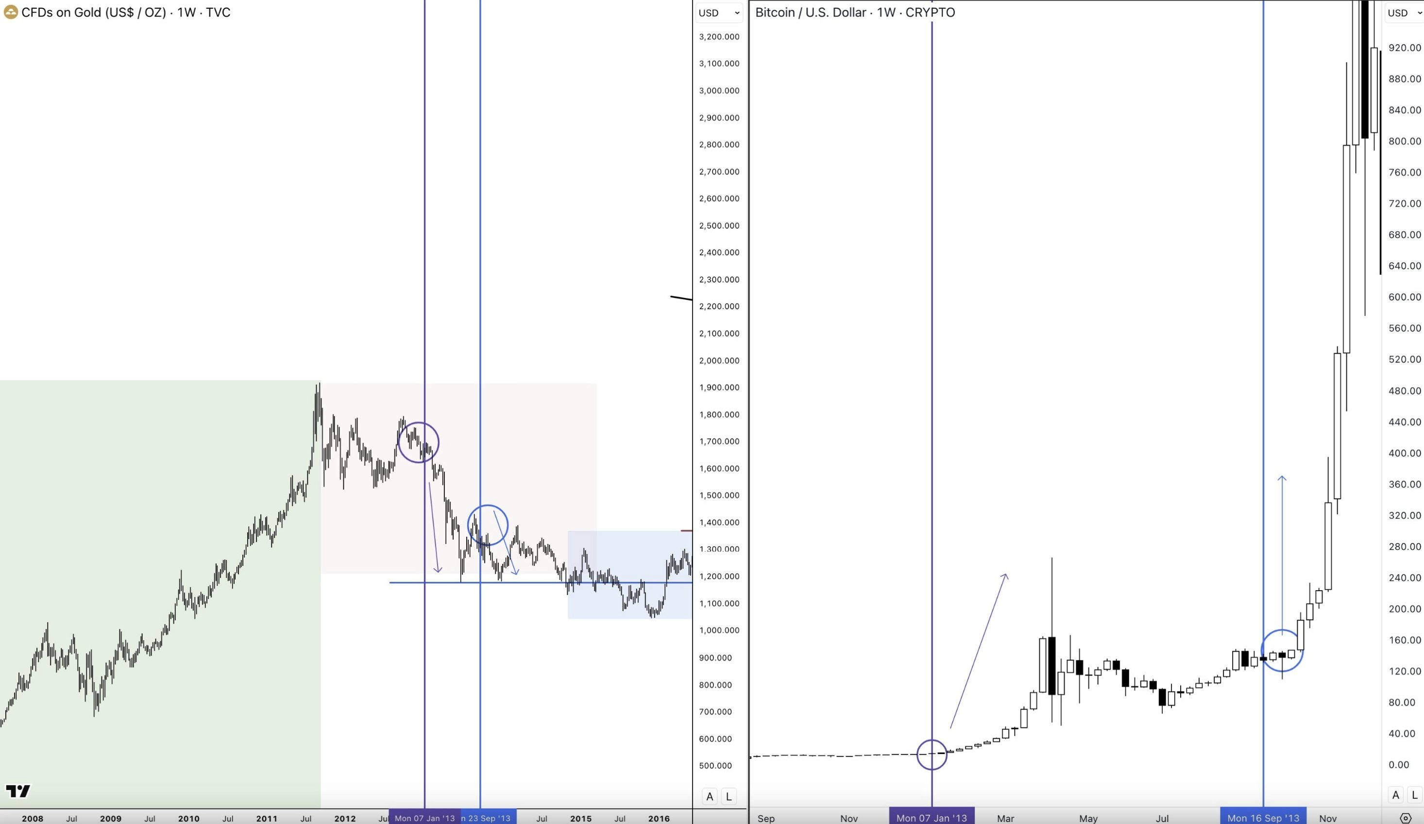 Non è un esempio perfetto, poiché Bitcoin non esisteva durante il mega rally multi-annuale dell'Oro.