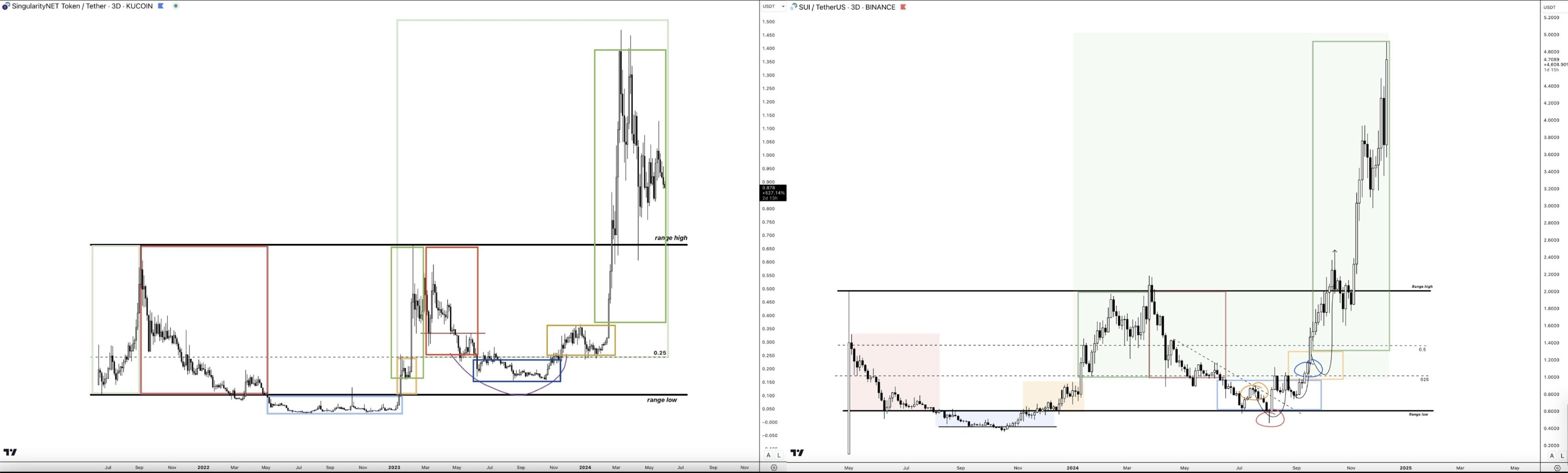 Con questi due, ad esempio (sopra), i loro mini cicli sono avvenuti dopo che i prezzi hanno raggiunto i massimi del range macro del ciclo macro, già nella fase 5.