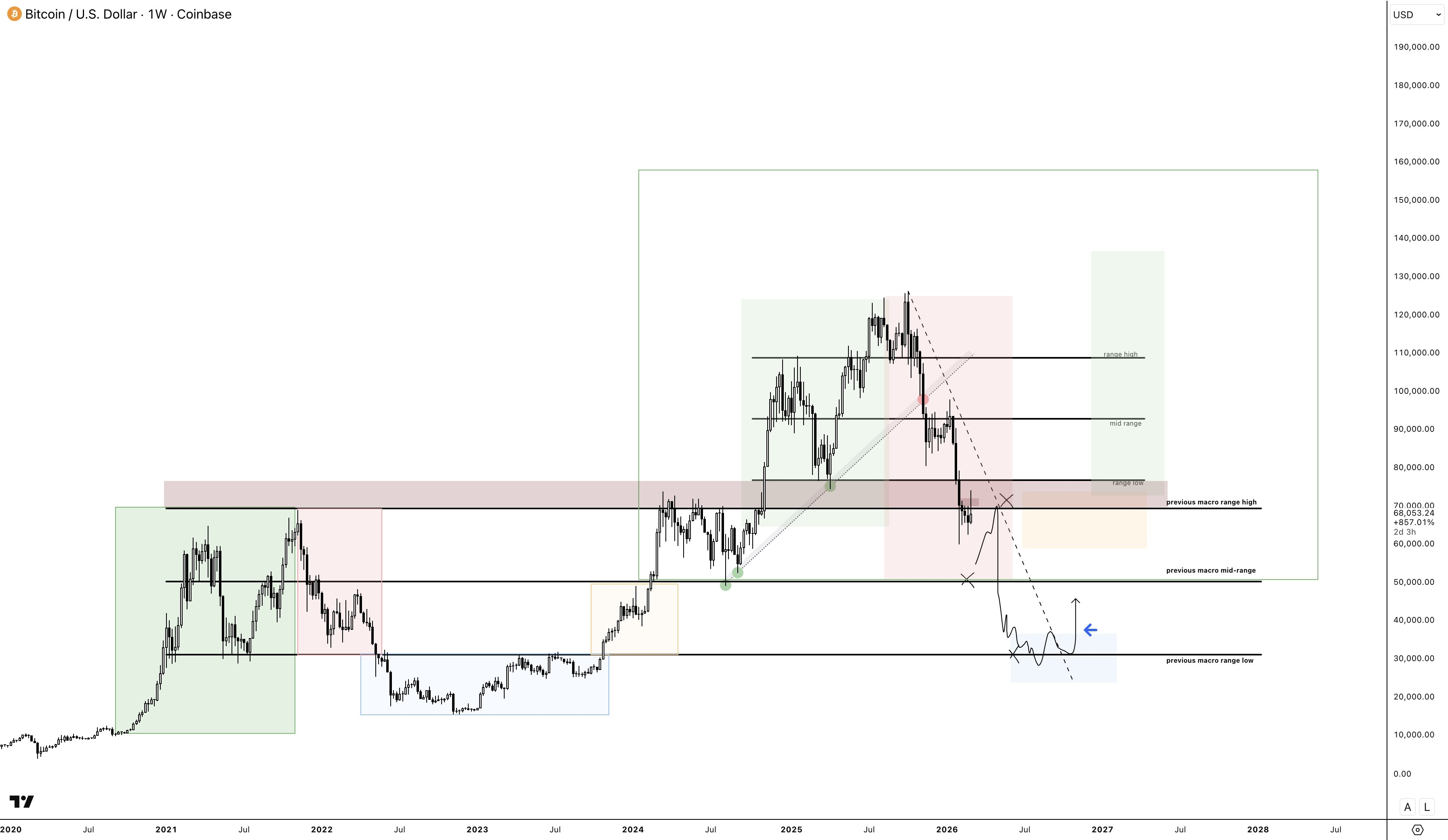 - L'attuale massimo del range ha potenziale, ma finché non otteniamo il breakout e il riacquisto, potremmo: a) rimanere in range per molto più tempo, o b) più tardi quest'anno scendere più in basso per formare un fondo del mini ciclo attorno a uno degli altri livelli chiave: metà range → zone del minimo del range.