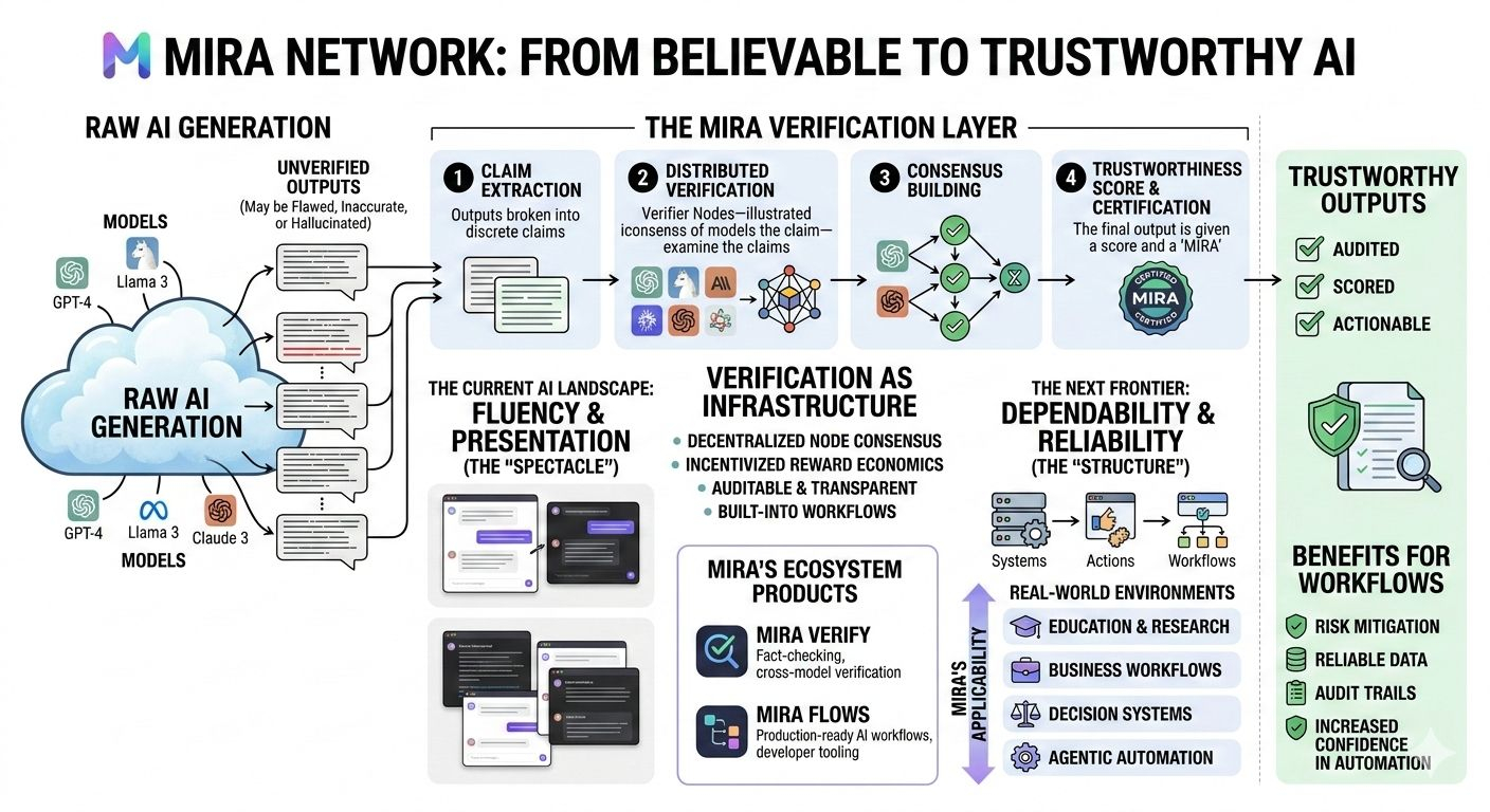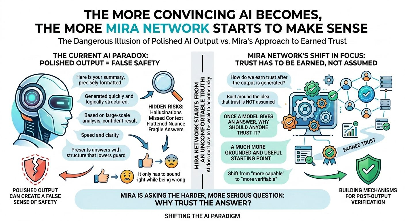 The more I looked into Mira, the clearer it became that this is not really about making AI sound better. It is about building a structure around AI so reliability does not depend on presentation alone. Mira positions itself as a verification layer, a network built to check outputs through distributed validation rather than asking users to simply trust the first thing a model says. That changes the conversation completely.