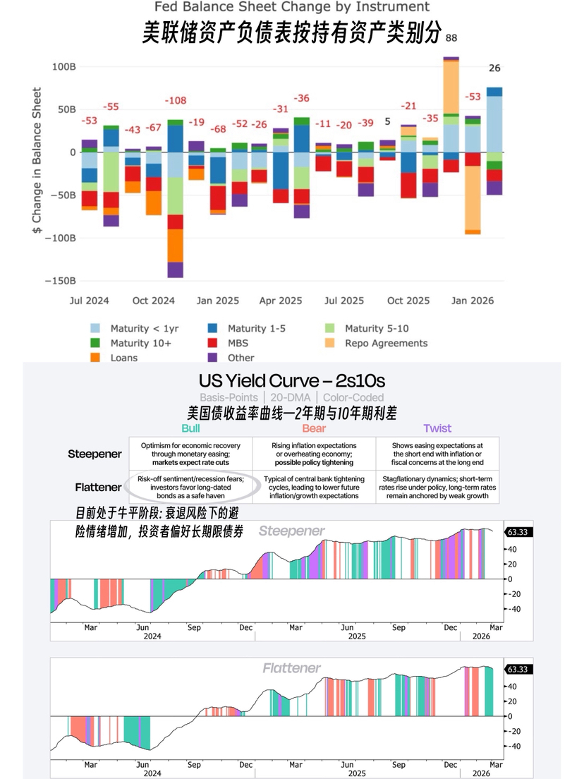 从美国国债收益率曲线上看,2年期与10年期国债利差显示出牛平行情。这意味着投资者依然忧心美国经济有衰退风险,纷纷加入购买长期国债寻求避险,而继续缩表则会加重衰退风险。