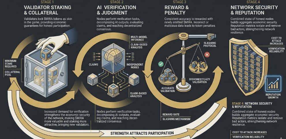Validators must stake MIRA to take part in the verification process. By committing tokens, they put economic value behind their validation choices. Accurate verification earns rewards, while repeated mistakes can lead to penalties.