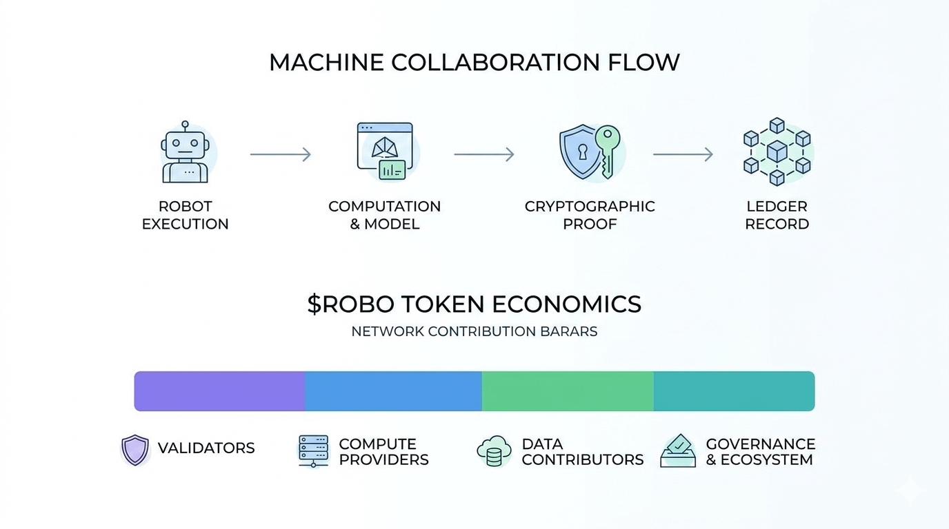 Then there is the economic layer that holds the network together. Fabric introduces the $ROBO token as the incentive mechanism. Validators are expected to secure the network. Compute providers supply infrastructure resources. Data contributors support the ecosystem by feeding the network with useful inputs. The token becomes the economic glue connecting all these participants.