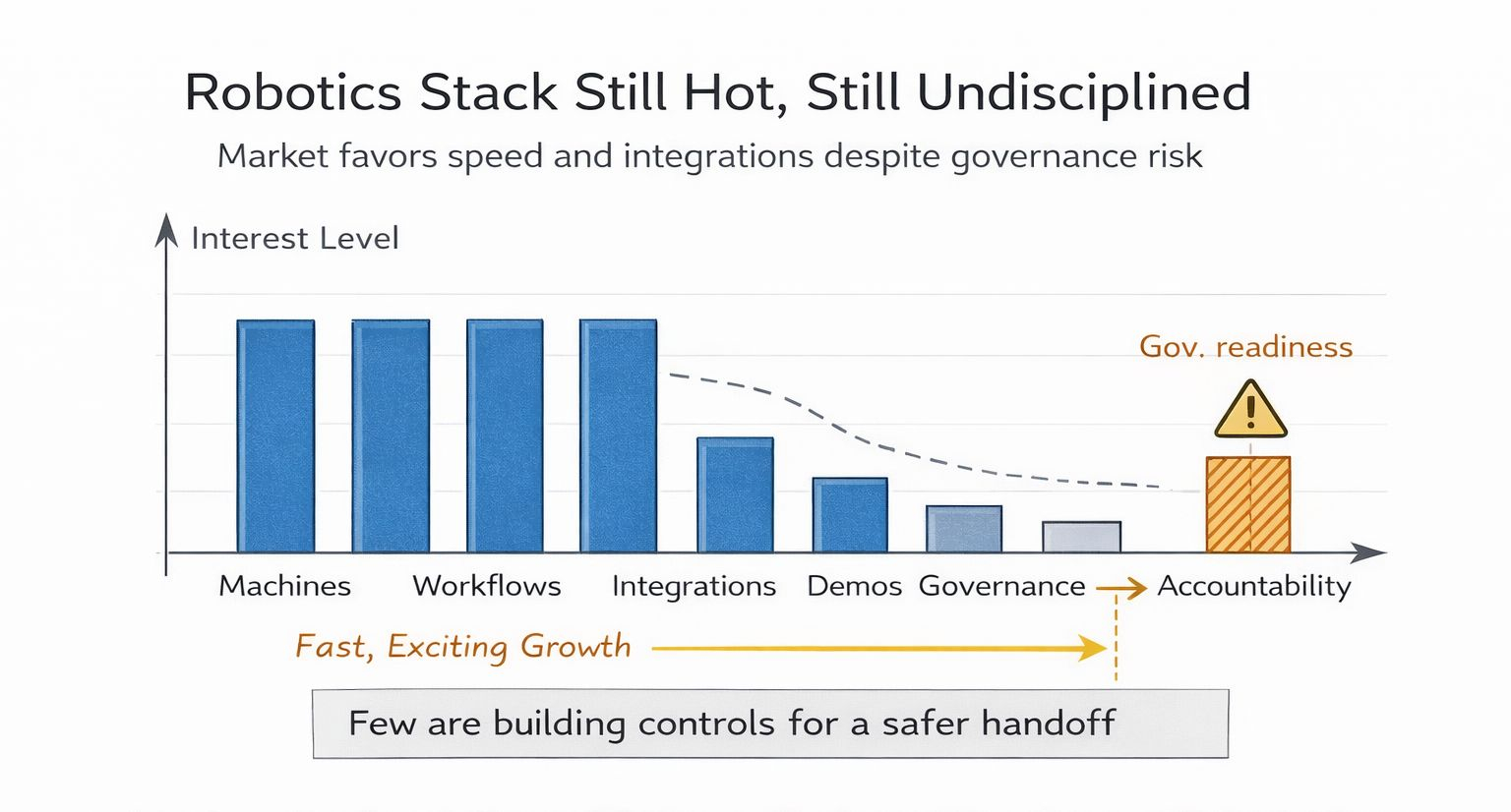 The broader market still feels like a manufacturing floor running hot with no inspection discipline. Everyone wants more machines, more integrations, more workflows, more demos that look like progress. But motion is not governance, and access is not accountability. Every time I look at the current robotics stack, it feels less like an operating model and more like a relay race where nobody wants to hold the baton for the handoff. The industry is still acting as if shared-machine operations can be managed with admin panels, chat approvals, and loose service contracts stitched together after the fact.