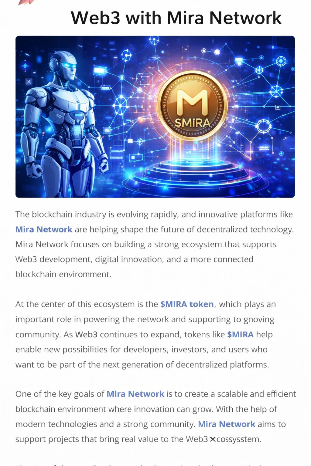 At the center of this ecosystem is the $MIRA token, which plays an important role in powering the network and supporting its growing community. As Web3 continues to expand, tokens like $MIRA help enable new possibilities for developers, investors, and users who want to be part of the next generation of decentralized platforms.