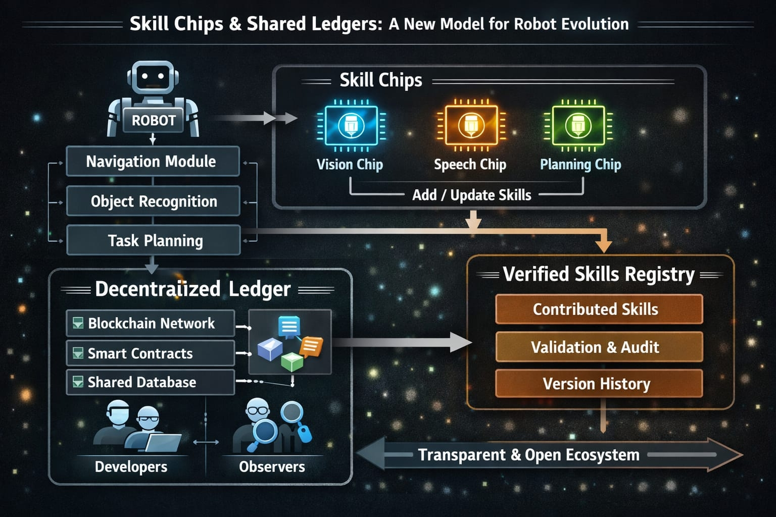 Through a public ledger, the network can coordinate computation, ownership and oversight of robotic capabilities.