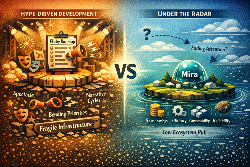 Infrastructure built under constant hype tends to warp itself to satisfy narrative cycles. Roadmaps become spectacle. Technical priorities start bending toward visibility instead of durability.