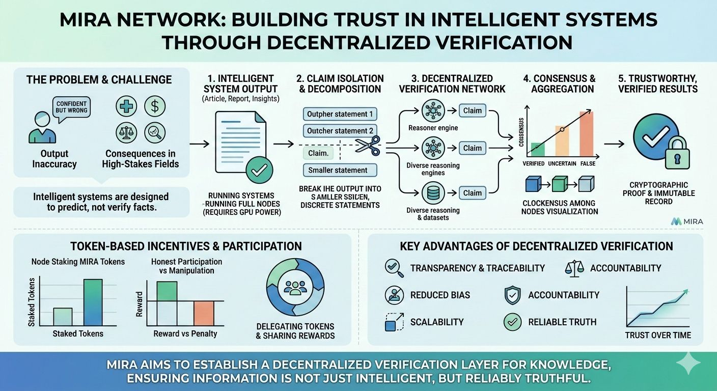 Mira Network was created to address this fundamental problem from a bold new angle. Instead of just building bigger, faster, or more complex systems, Mira constructs a decentralized verification layer a trust infrastructure for intelligent outputs. In essence, it brings the principles of blockchain consensus into the world of knowledge verification. Rather than depending on a single authority, model, or company to determine what is true, Mira relies on a distributed network where multiple participants collectively verify claims.