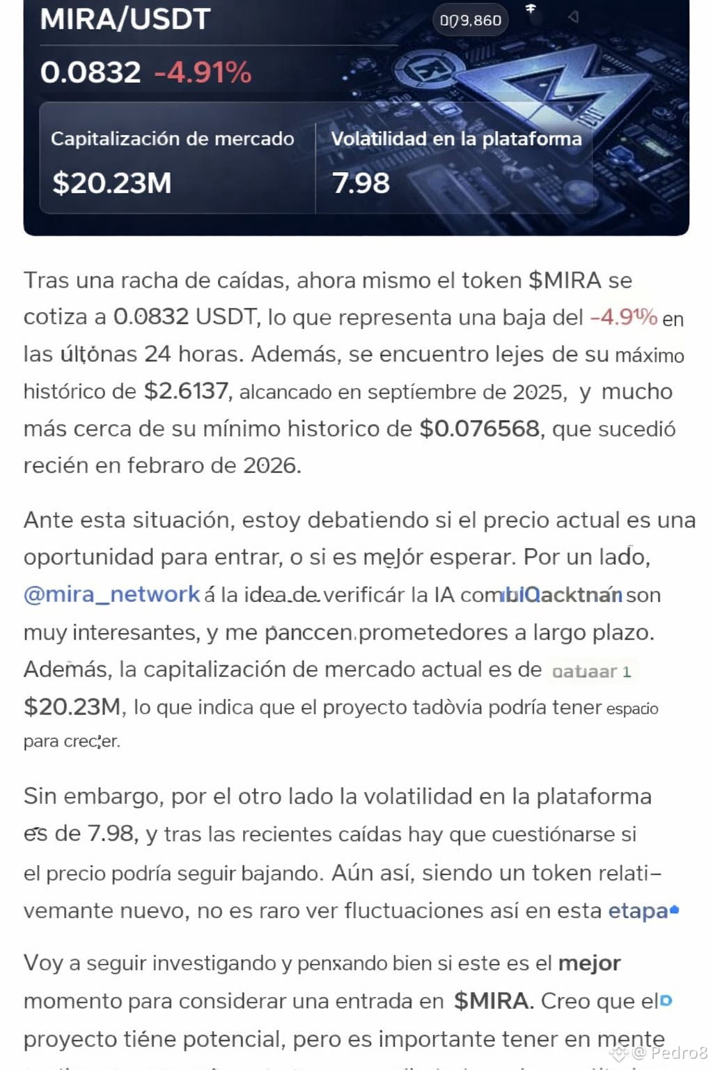 Hoy estuve mirando los datos del token $MIRA y me llamó la atención la situación actual del mercado. En este momento el precio ronda los 0.083 USDT, con una caída cercana al -4.9% en las últimas 24 horas. Además, si se observa el historial, está bastante lejos de su máximo histórico de $2.61, alcanzado en 2025, y mucho más cerca de su mínimo reciente.