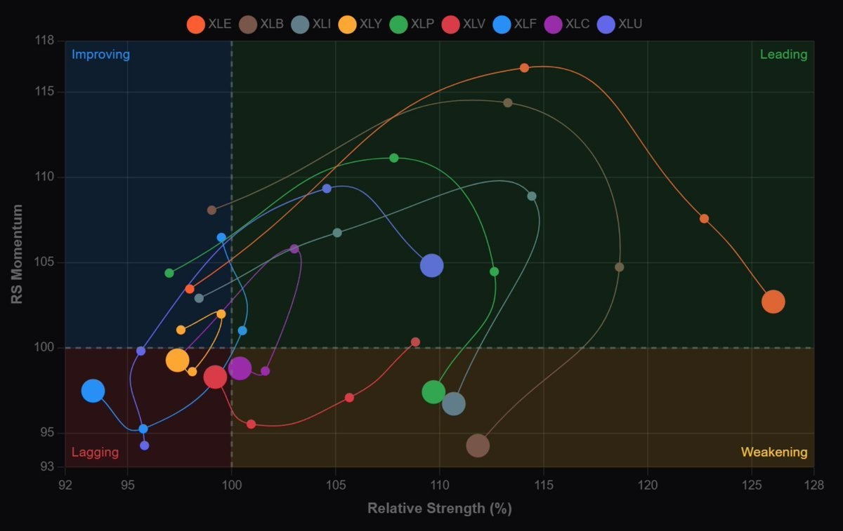 Ciò che vediamo nei grafici di rotazione dei settori è essenzialmente una mappa di dove la forza si concentra oggi e dove la debolezza si sta sviluppando.