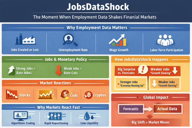 Sometimes job numbers are released and they look very different from what economists predicted. When this happens, markets react quickly and sometimes violently. Traders call this situation a JobsDataShock — a moment when employment data surprises investors and forces markets to rapidly reprice risk.