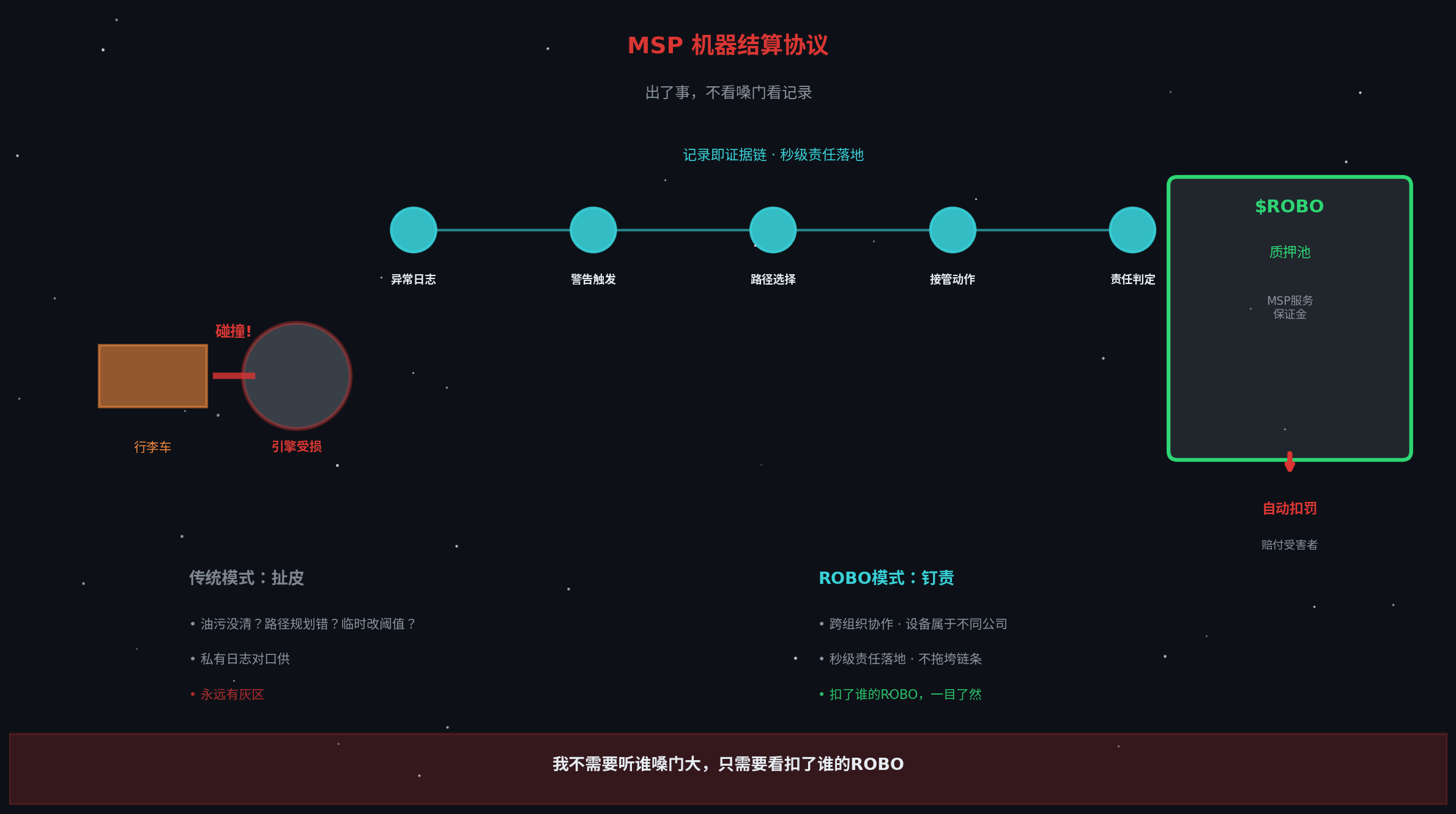 Nella realtà, quando ci sono collisioni, il più comune non è riparare immediatamente, ma iniziare subito a litigare: non è stata pulita la macchia di olio? È sbagliata la pianificazione del percorso? O qualcuno ha cambiato temporaneamente la soglia? Se ogni azienda fornisce le proprie dichiarazioni solo nei registri privati, ci sarà sempre una zona grigia. Il MSP (Machine Settlement Protocol) di ROBO riporta la responsabilità alla registrazione: log di anomalie, attivazione di avvisi, scelta del percorso, assunzione di azioni, tutto secondo le regole. L'errore confermato attiva un contratto, addebitando il risarcimento dal deposito di $ROBO . Il piazzale è un campo estremo di collaborazione interorganizzativa: le attrezzature appartengono a diverse aziende, la responsabilità deve essere concretizzata in tempo reale, altrimenti ogni incidente mette a rischio l'intera catena. Non ho bisogno di sentire chi è più forte, ho solo bisogno di vedere chi ha perso ROBO.