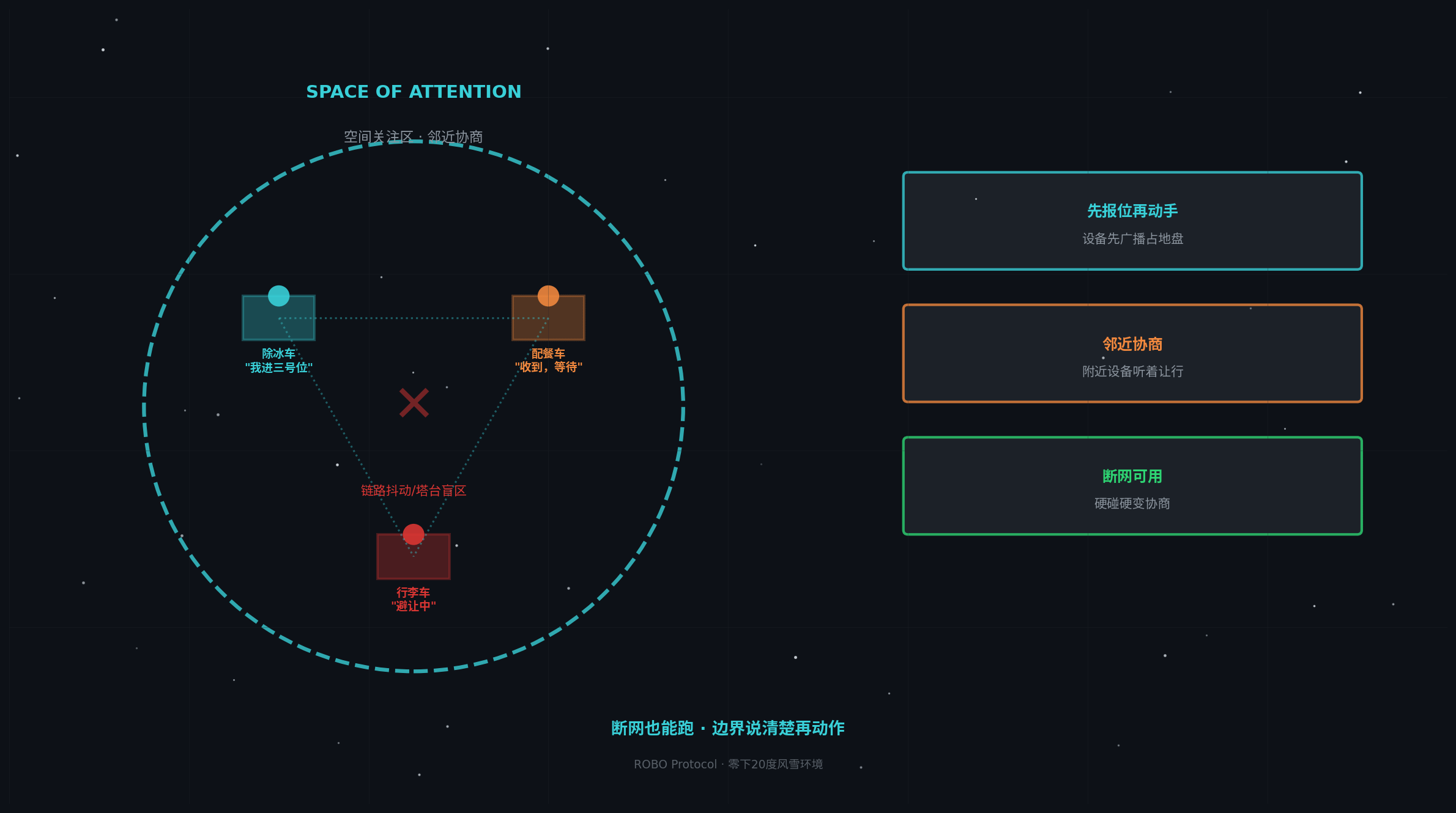 Le zone d'ombra sotto le ali, le interferenze da pioggia e neve, i riflessi notturni, rendono impossibile aspettarsi che la pianificazione centrale chiami sempre in tempo per frenare. Lo Space of Attention (zona di attenzione) di ROBO funziona più come "prima comunica la posizione e poi inizia a muoverti": le attrezzature devono prima dire "voglio occupare questo spazio, seguire questa linea", e le attrezzature vicine devono cedere. Anche se il collegamento è instabile e la torre è temporaneamente cieca, questa "negoziazione vicina" può comunque funzionare, evitando collisioni dirette. Proprio come il veicolo di de-icing deve prima annunciare "sono in posizione tre", e gli altri veicoli devono aspettare. Prima di chiarire i confini, poi si può procedere.