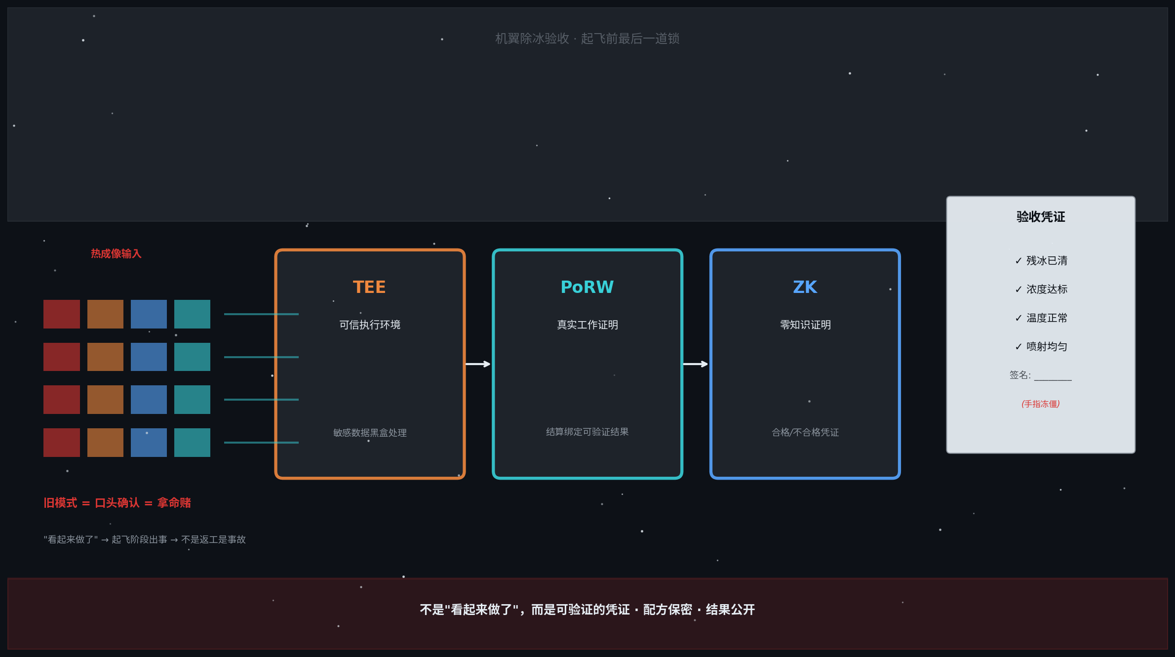 Il de-icing è il più tipico. Spruzzare non è sufficiente, concentrazione giusta o non è stata pulita l'ice residue, affidarsi a conferme verbali è come scommettere la vita. Il PoRW (Proof of Real Work) di ROBO lega i pagamenti a risultati verificabili, non è sufficiente dire "ho spruzzato" per ricevere il pagamento. Dati sensibili—come caratteristiche di imaging termico, parametri di spruzzatura—vengono elaborati nell'TEE (Trusted Execution Environment) di ROBO, e poi utilizzando lo ZK (Zero-Knowledge Proof) di ROBO viene fornita una certificazione "idoneo/non idoneo". Puoi verificare che sia stato fatto secondo gli standard, ma non ottieni i dettagli della formula del fornitore. Il piazzale teme "sembra che sia stato fatto", nel momento in cui ci sono problemi in fase di decollo, il costo non è rifacimento, ma incidente. Le mie dita erano intorpidite dal freddo, ma quando ho visto quel certificato, ho osato firmare per il rilascio.