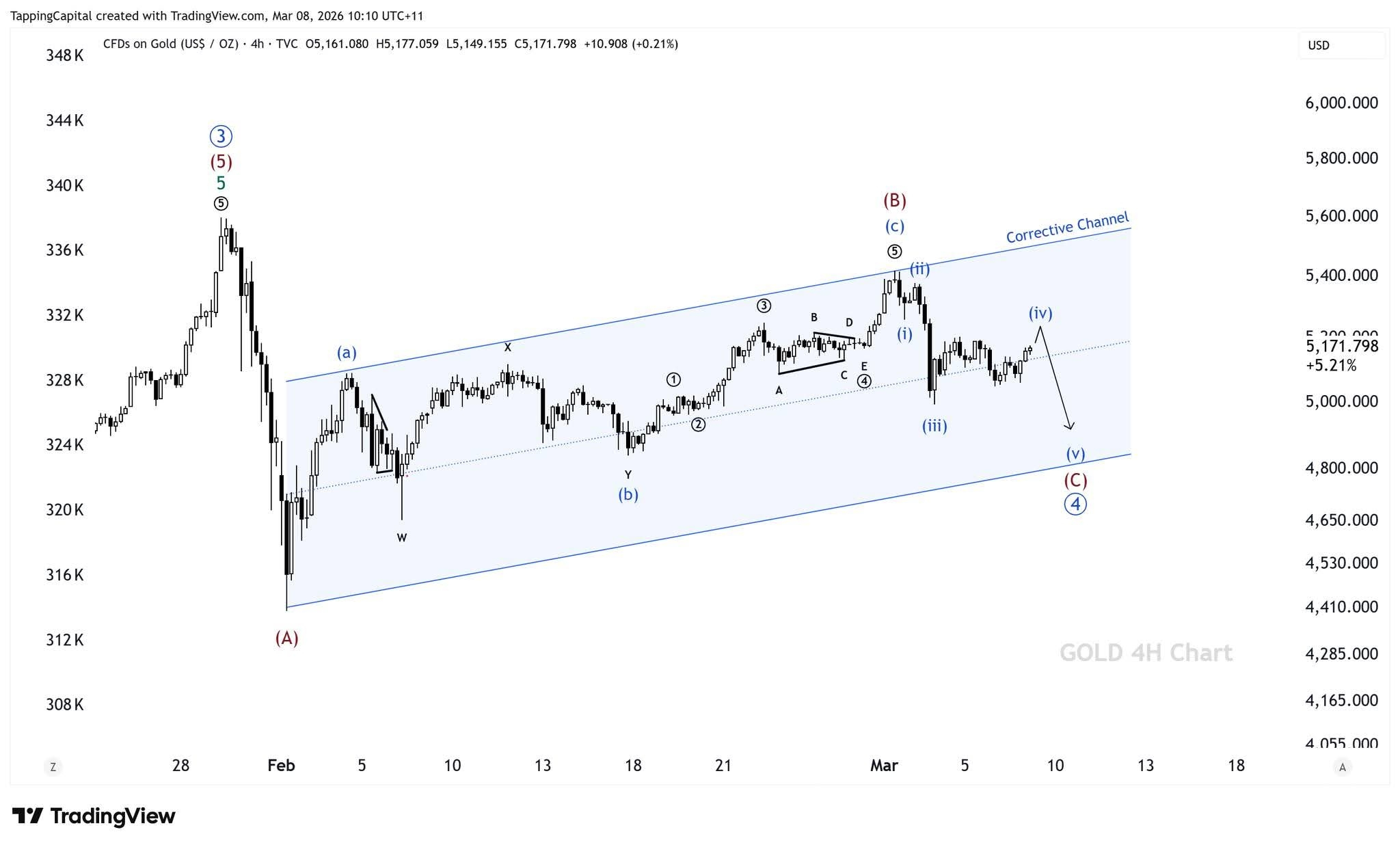 If Gold breaks impulsively above the recent highs near $5,400, the corrective count would likely be invalidated.