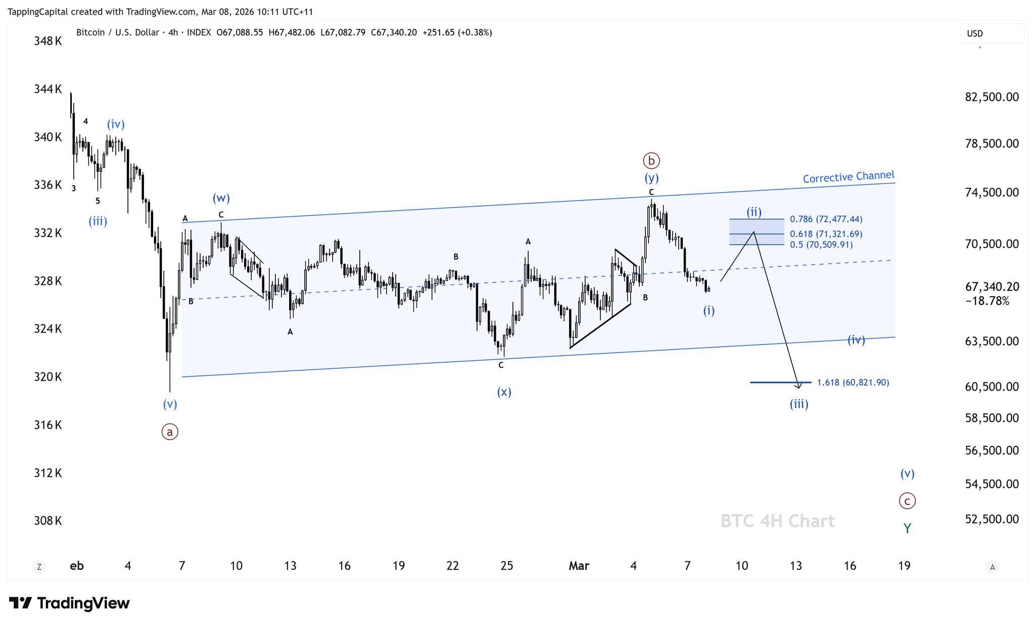 The rally into the $73k region appears to have completed a corrective (y) / (b) structure near the upper boundary of the channel.