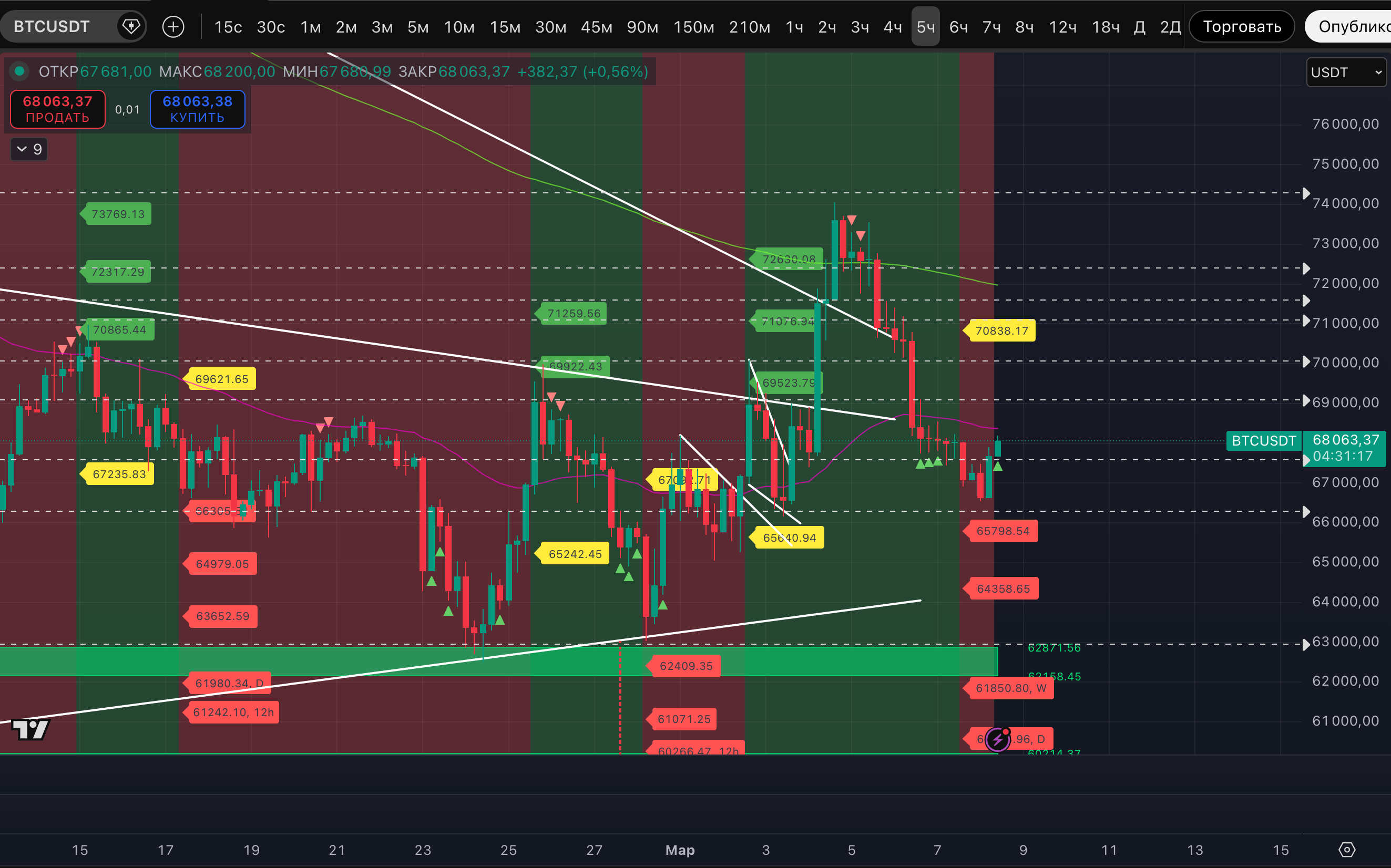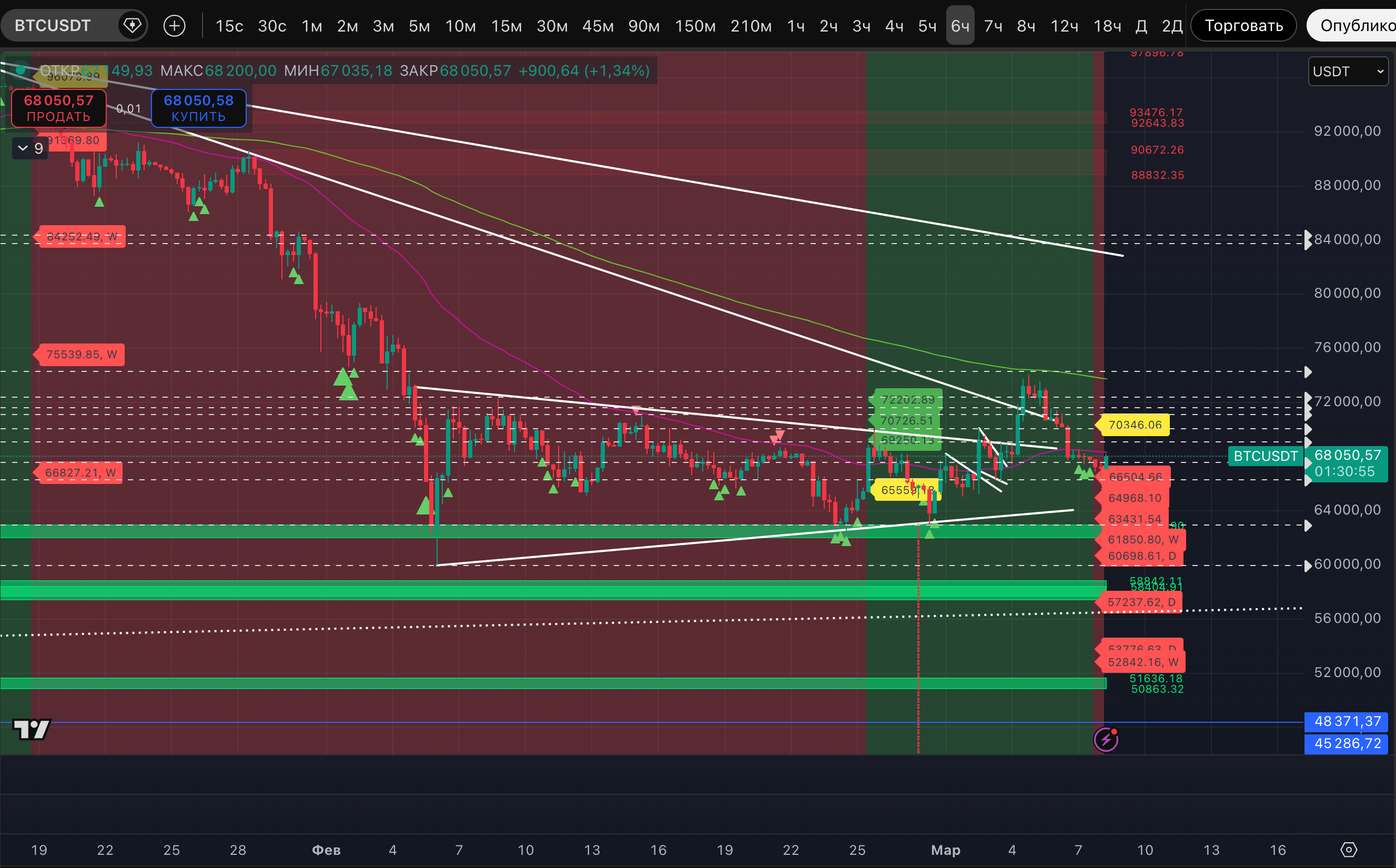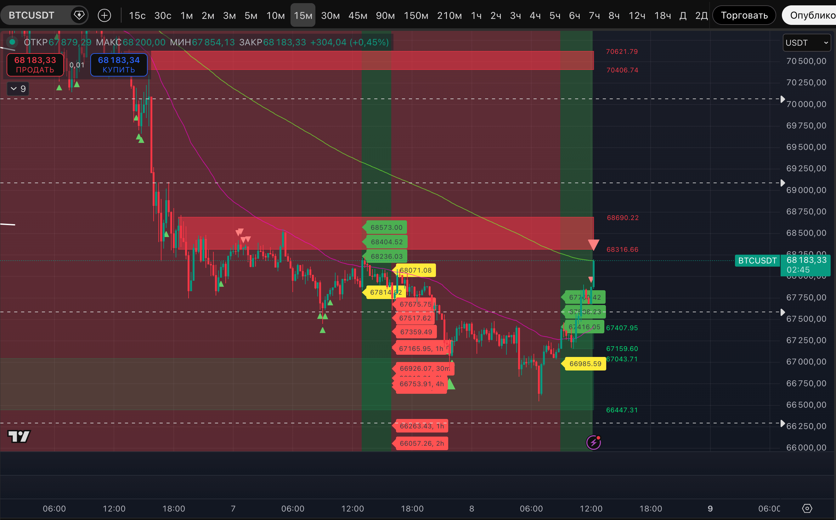 Inoltre, il rimbalzo attuale ha portato al fatto che il prezzo è passato per la prima volta dal 5 marzo a un trend rialzista sostenibile sulla TF di 45 minuti. Con obiettivi di base fino a 68 518$. E un livello di potenziale rottura a 67 094$.