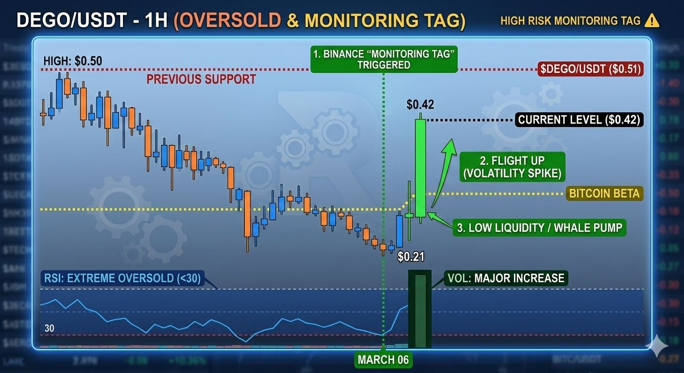 On March 6, 2026, Binance added a "Monitoring Tag" to $DEGO. Usually, this is a warning that a token is high-risk and at risk of delisting. However, in low-liquidity markets, this often triggers a "volatility spike" as traders rush in to play the resulting price swings. The increased scrutiny has paradoxically brought a massive wave of eyes—and volume—to the token.