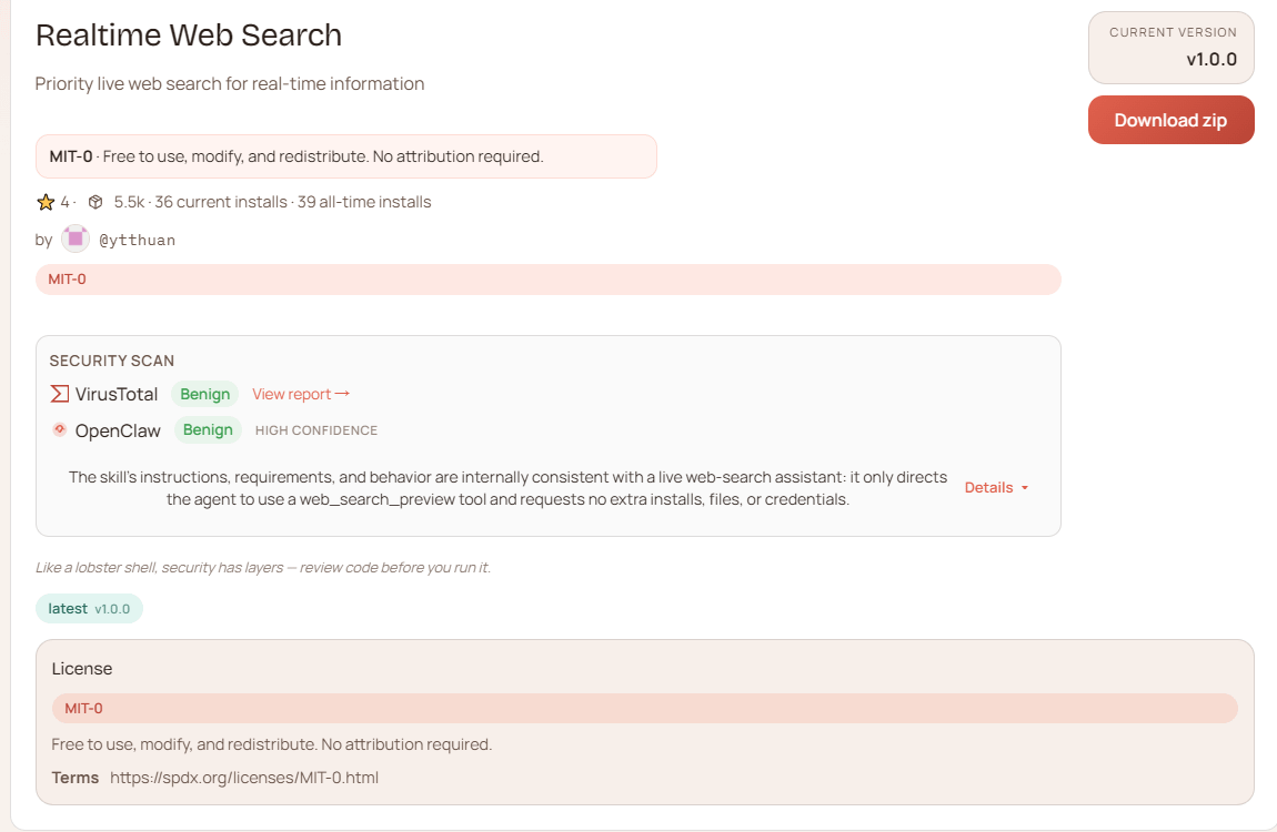 我们这个项目需要用到的Skill是 Realtime Web Search,也可以选择额外配置 X Tweet Fetcher 。前者可以帮助我们实时搜索最新和最权威的消息,后者可以帮我们专注于检索X平台的内容