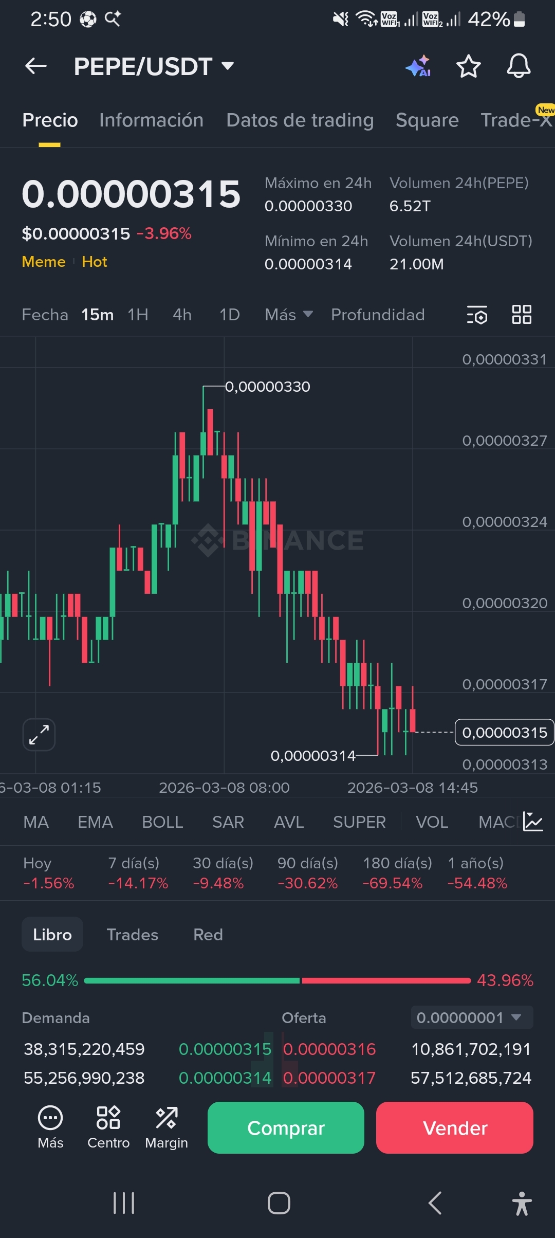 El gráfico de $PEPE muestra una clara estructura bajista. Tras perder el soporte clave en los 0.00000347, la presión de venta ha dominado el mercado. Actualmente cotizando cerca de 0.00000315, el activo muestra máximos cada vez más bajos, lo que indica una falta de interés comprador en estos niveles.