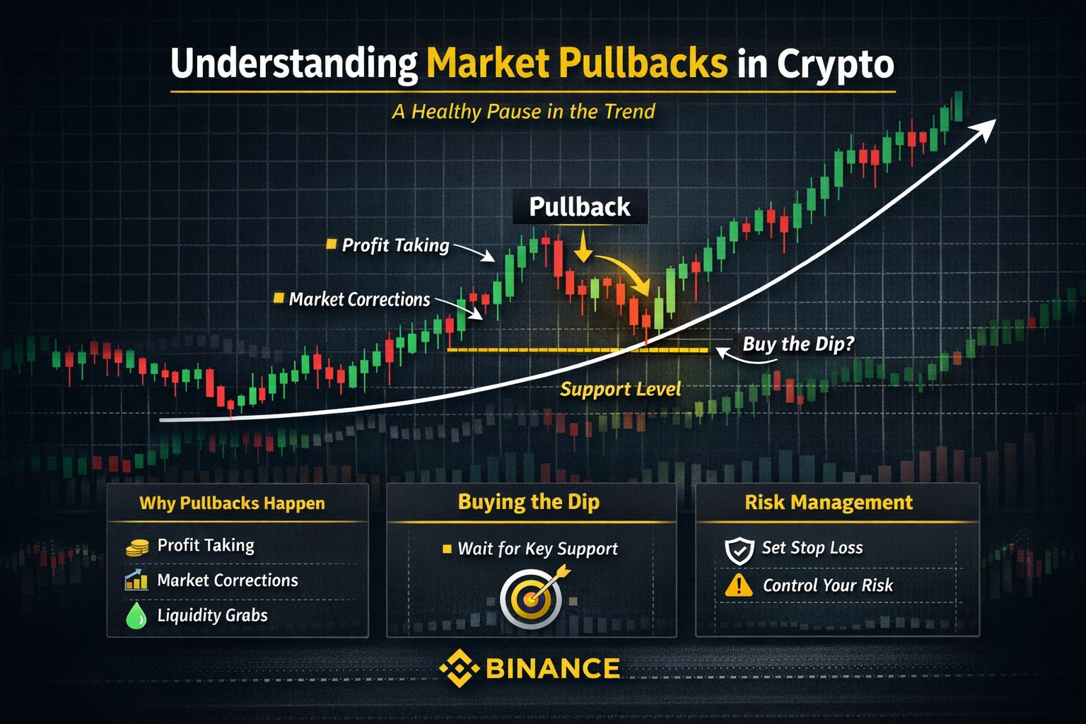 In the fast-moving world of crypto trading, a market pullback is a normal and healthy part of any trend. A pullback happens when the price temporarily moves against the main trend before continuing in the original direction.