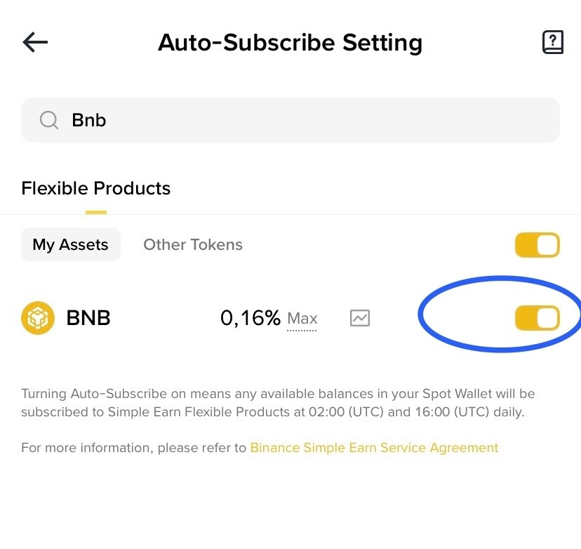 Trong màn hình Auto-Subscribe Setting, bật lựa chọn Auto Subscribe cho Crypto bạn muốn đăng ký.