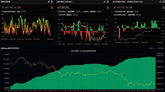 Sosovalue數據上,恐懼貪婪指數又再次跌回個位數。$BTC ETF資金保持連續兩週淨流入,大額穩定幣趨勢平穩。綠葉槓桿數據也維持緩慢累積。