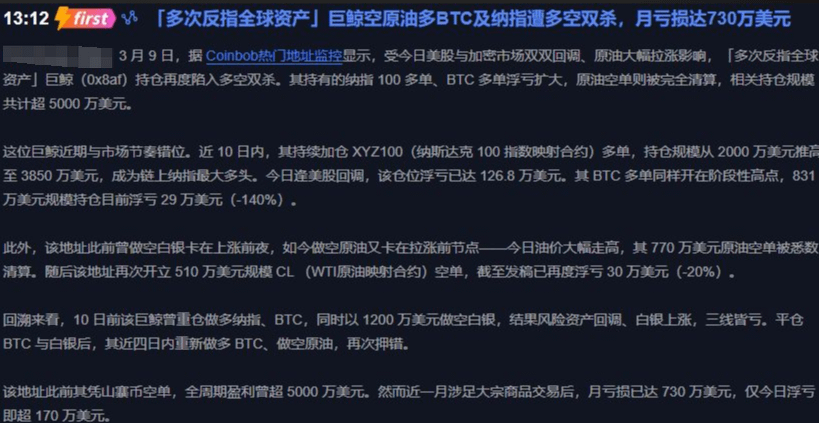 新闻里说,这头巨鲸最近点背到家了。他一边重仓做多纳斯达克指数和BTC,另一边做空原油。结果呢?美股和加密市场回调,原油反倒暴涨。直接导致他的纳指和BTC多单浮亏,原油空单被直接“活埋”,强行平仓。最秀的是,平完仓他不服,又开了原油空单,结果接着亏。