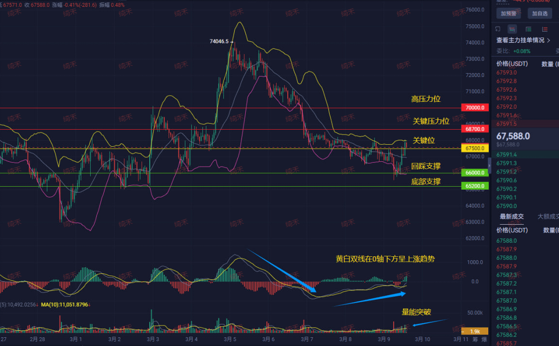 支撑在哪:当前价格在67500附近徘徊,这里是一个短期的多空争夺点。下面的强支撑大概在。