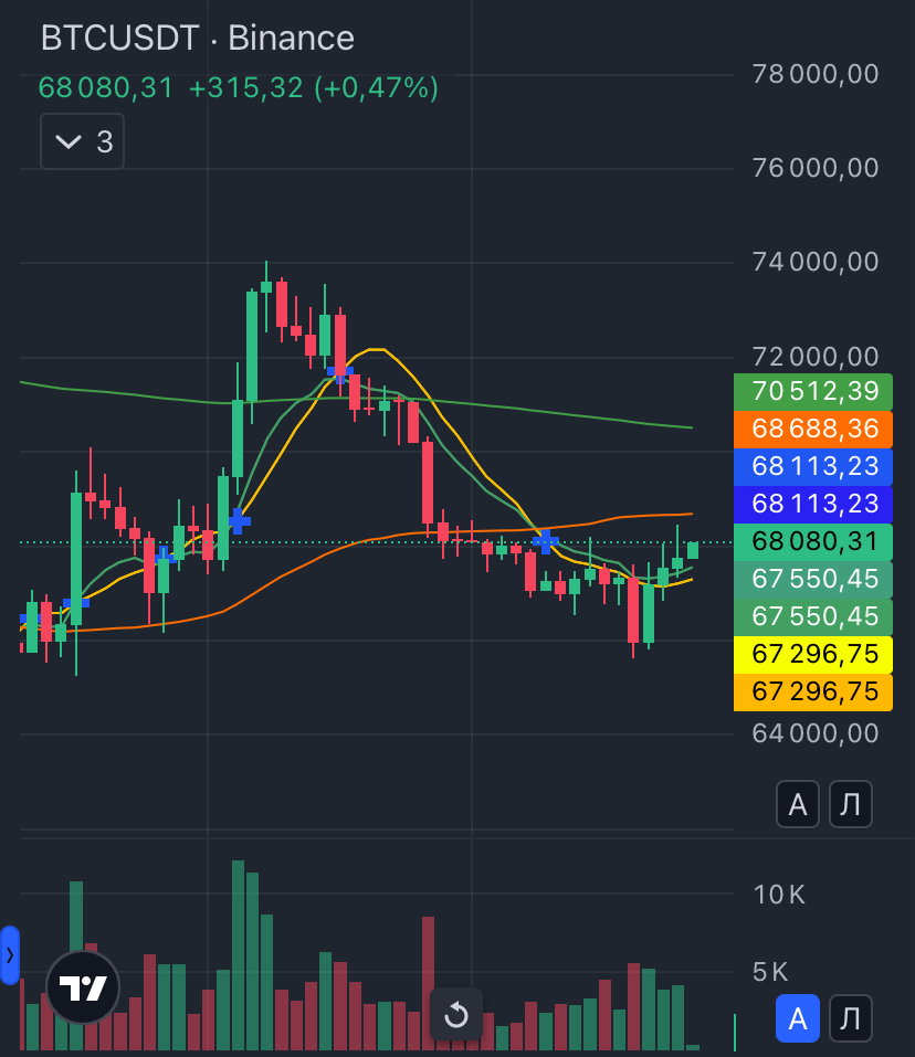 Сопротивление: Ключевая зона — $70,000–$72,000. На дневном графике здесь проходит 50 EMA, которая пока выступает мощным «потолком» для цены.