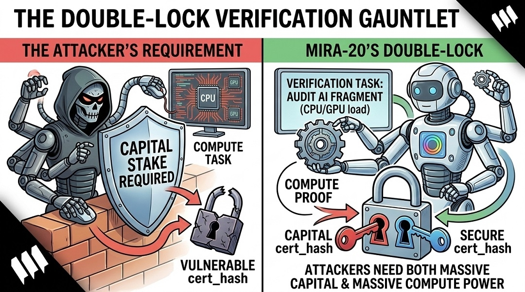 The technical brilliance of the Mira-20 blockchain isn't in its speed alone, but in its "Verification Gauntlet." When an AI agent proposes a transaction or an output, the network doesn't just ask for a vote. It requires validators to perform specific "Verification Tasks" that demand actual CPU/GPU effort. These tasks are essentially a form of Proof-of-Work, but instead of solving useless hashes, the work is dedicated to auditing AI fragments. By combining this with a staked authority model, Mira creates a "Double-Lock" mechanism. To subvert the cert_hash, an attacker would need both massive capital (to bypass the staking requirement) and massive compute power (to fake the verification tasks). The probability of both occurring simultaneously decreases exponentially as the network grows.