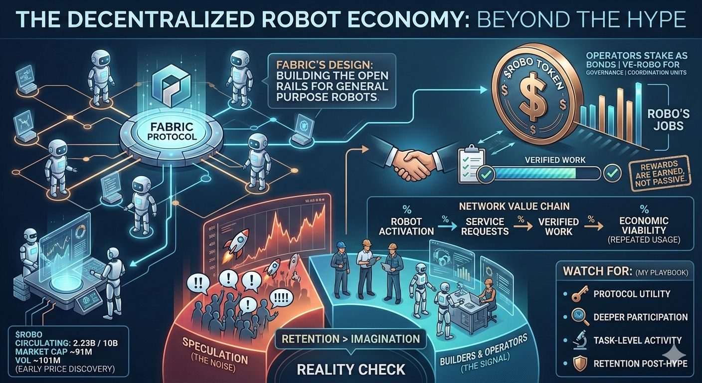 So, here’s my playbook. I’m watching to see if $ROBO translates into actual protocol utility. I want to see operator participation deepen, task-level activity become visible, and retention hold up once the speculative crowd inevitably gets bored. If you’re looking at Fabric Protocol, don’t just stare at the candles. Watch to see if the network actually earns its right to exist when the noise leaves the room. Because that’s where the fantasy ends, and real conviction begins.