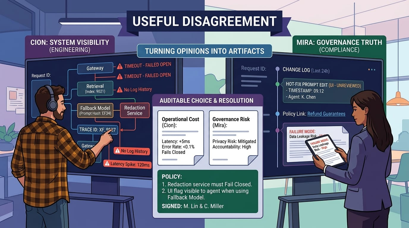 Mira’s disagreement isn’t “be more careful.” It’s “make the system able to tell the truth about itself.” Cion’s disagreement isn’t “stop slowing us down.” It’s “make the controls survivable under load.” Those are compatible goals. They just don’t look compatible when a deadline is two weeks away.